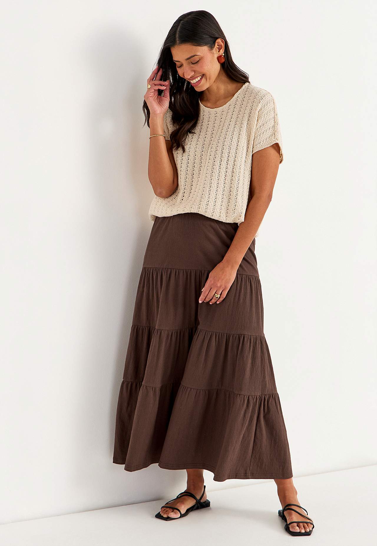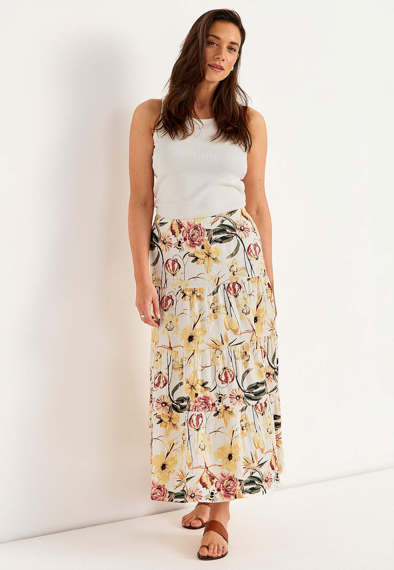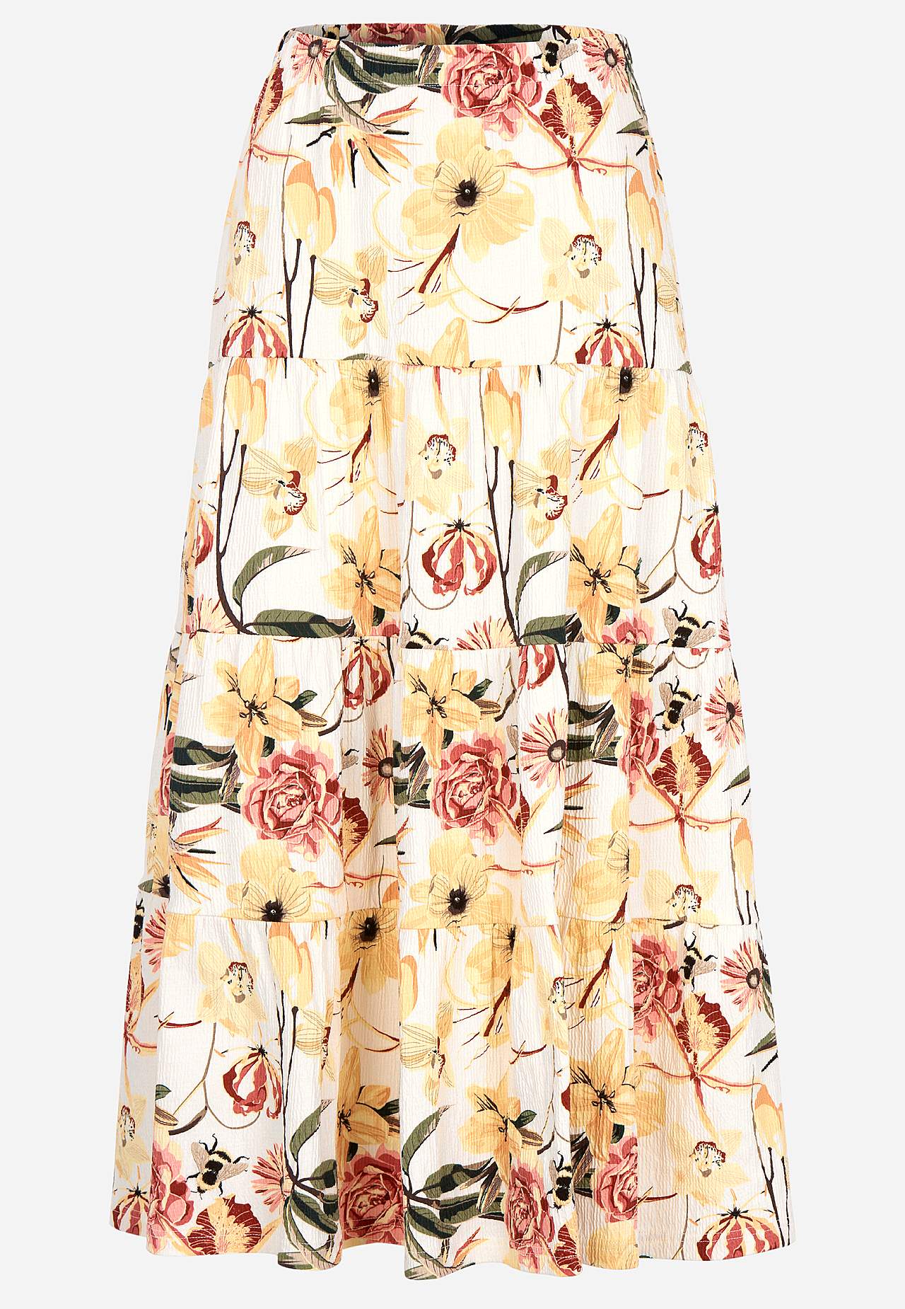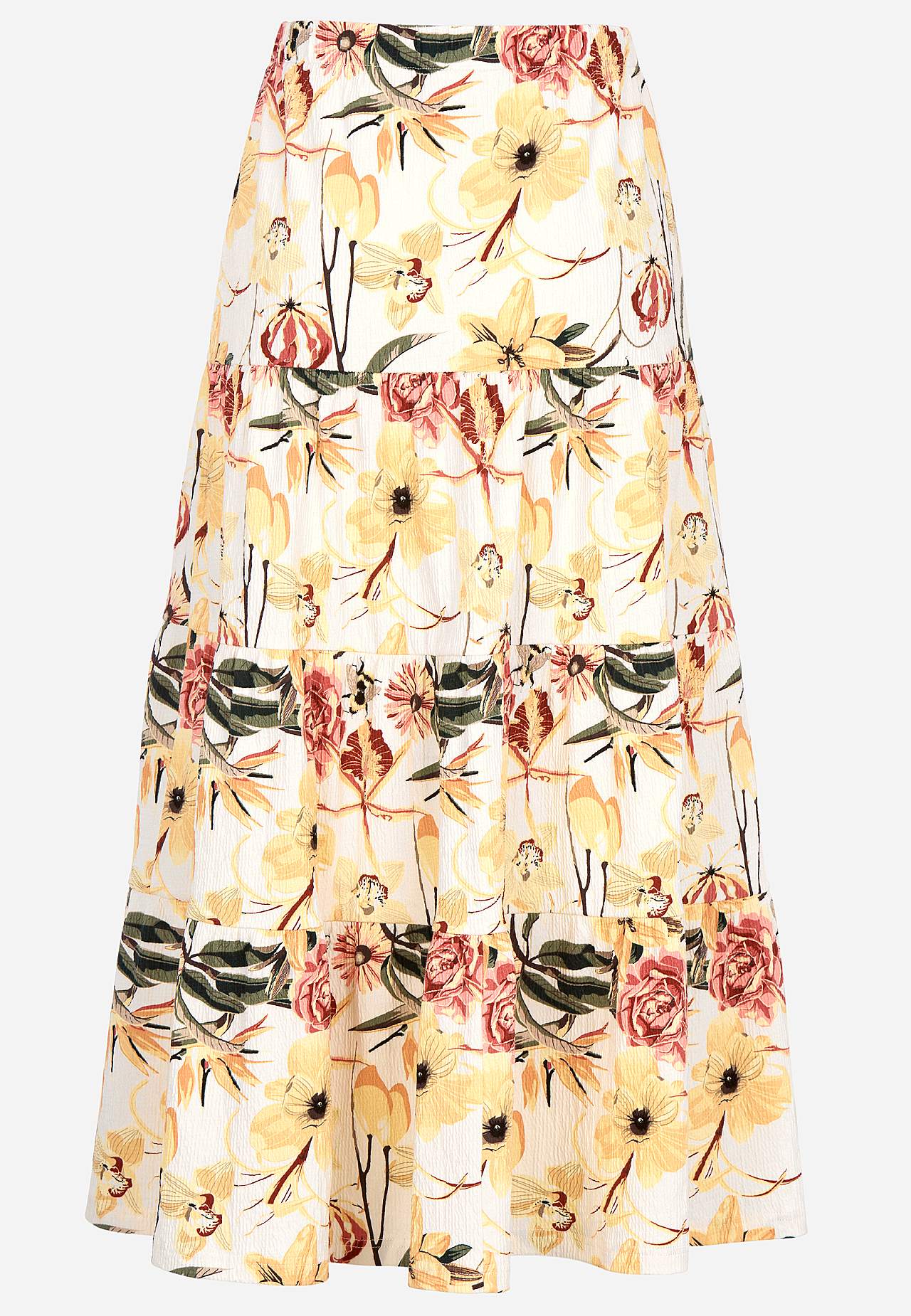 Miękka i elastyczna spódnica z falistą strukturą. Rozszerzany na dole fason ze szerokością na spodzie. Talia z miękką i szeroką gumą. Zaokrąglony brzeg. Połącz z 701369. Długość: 90 cm.