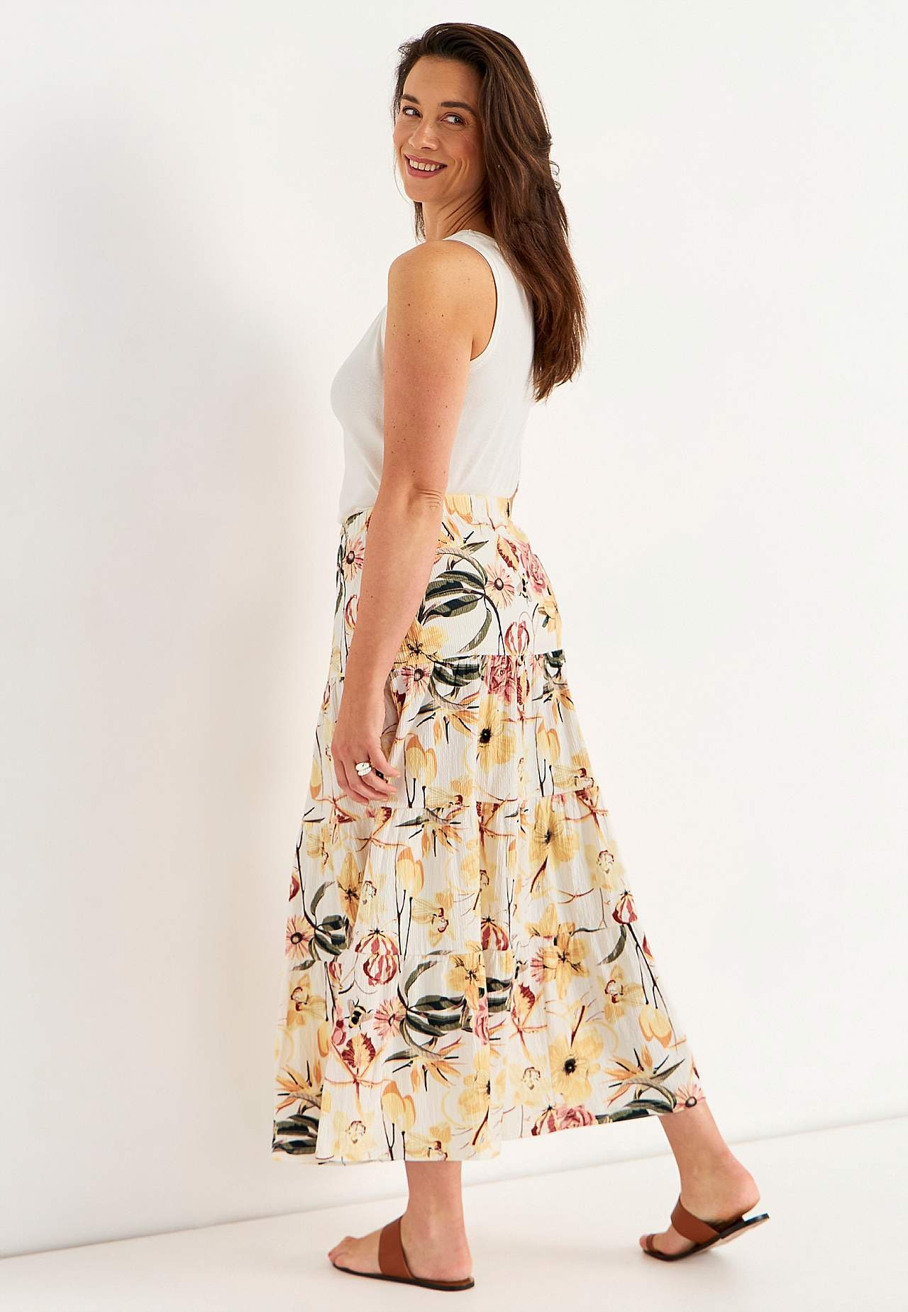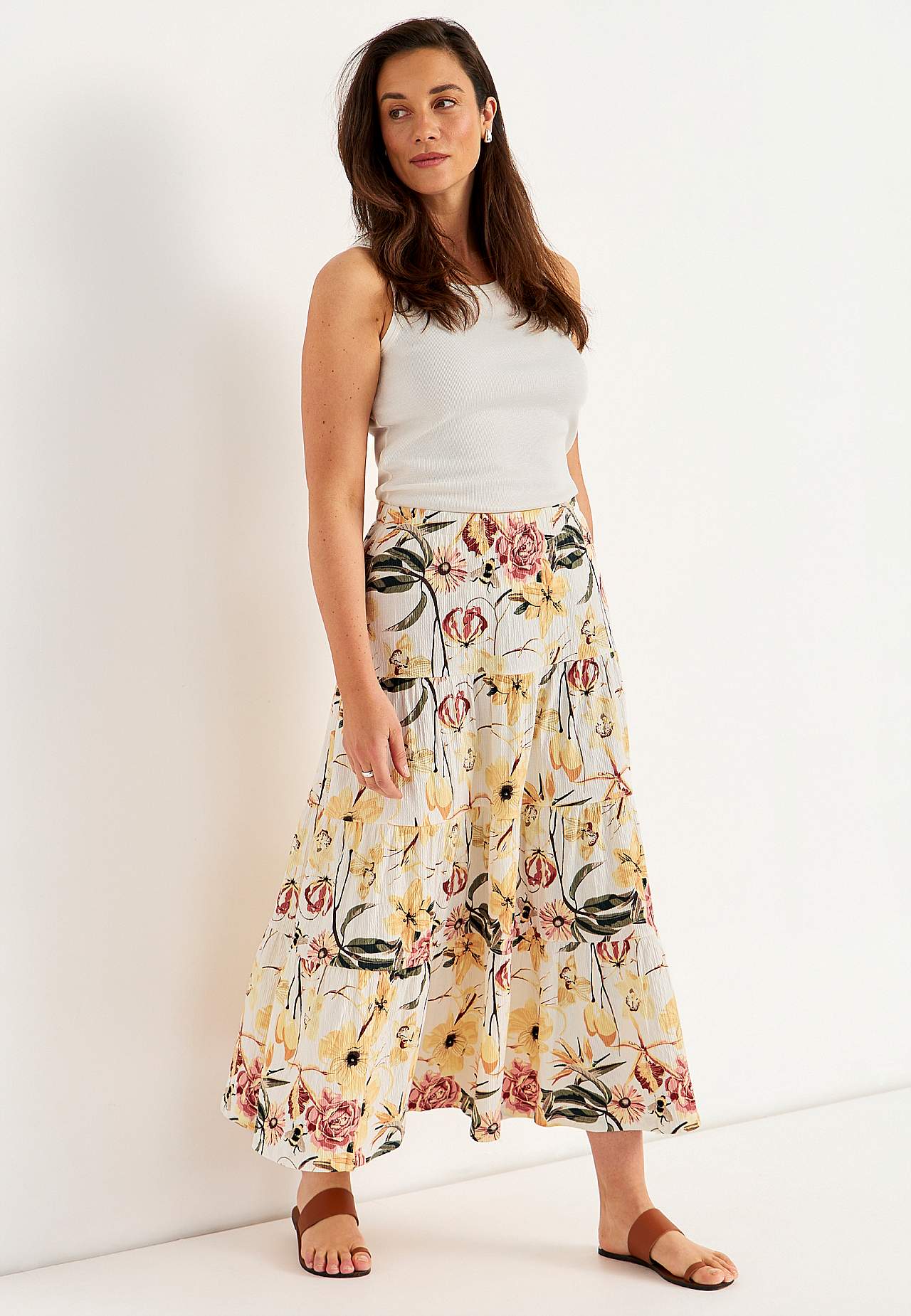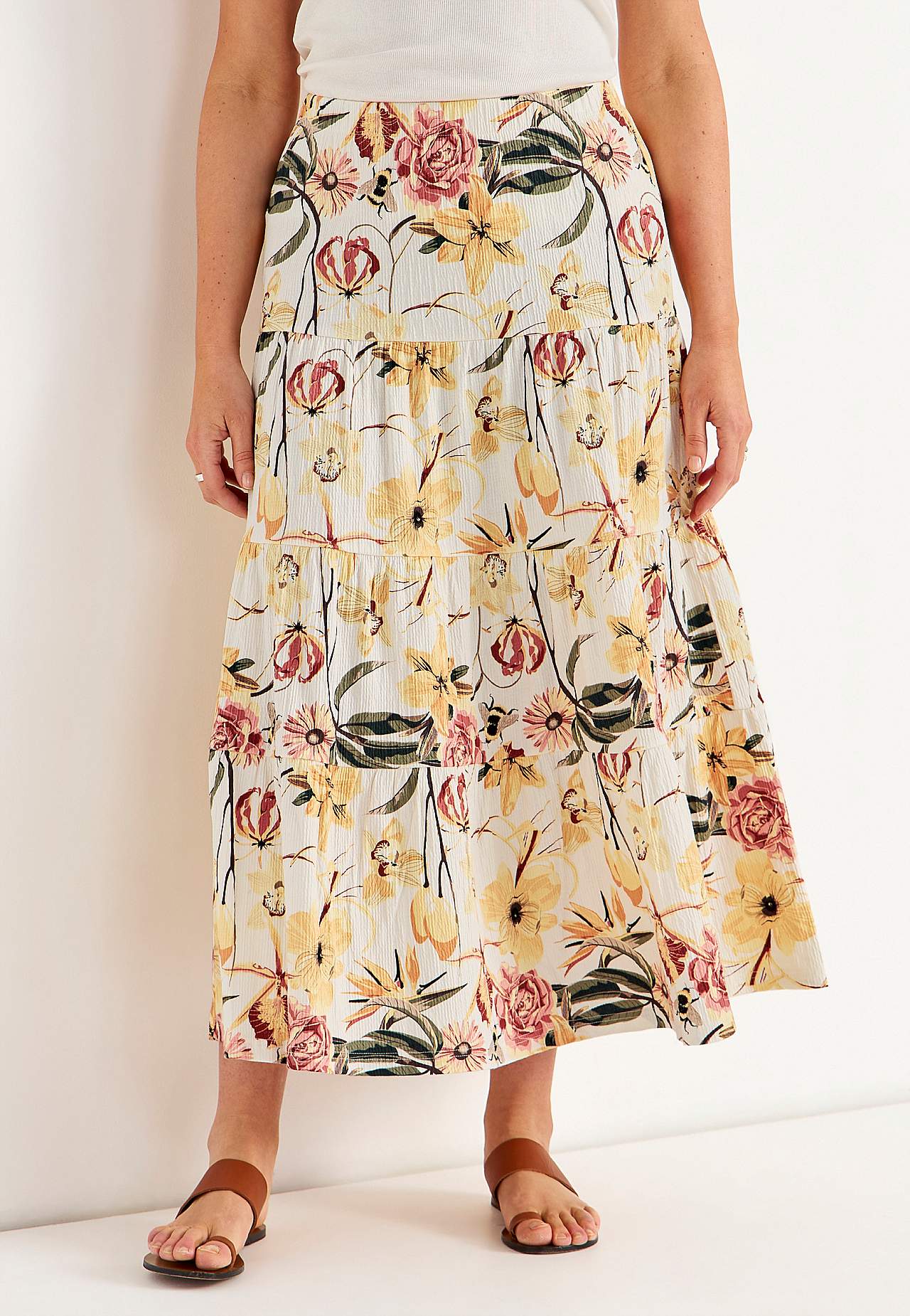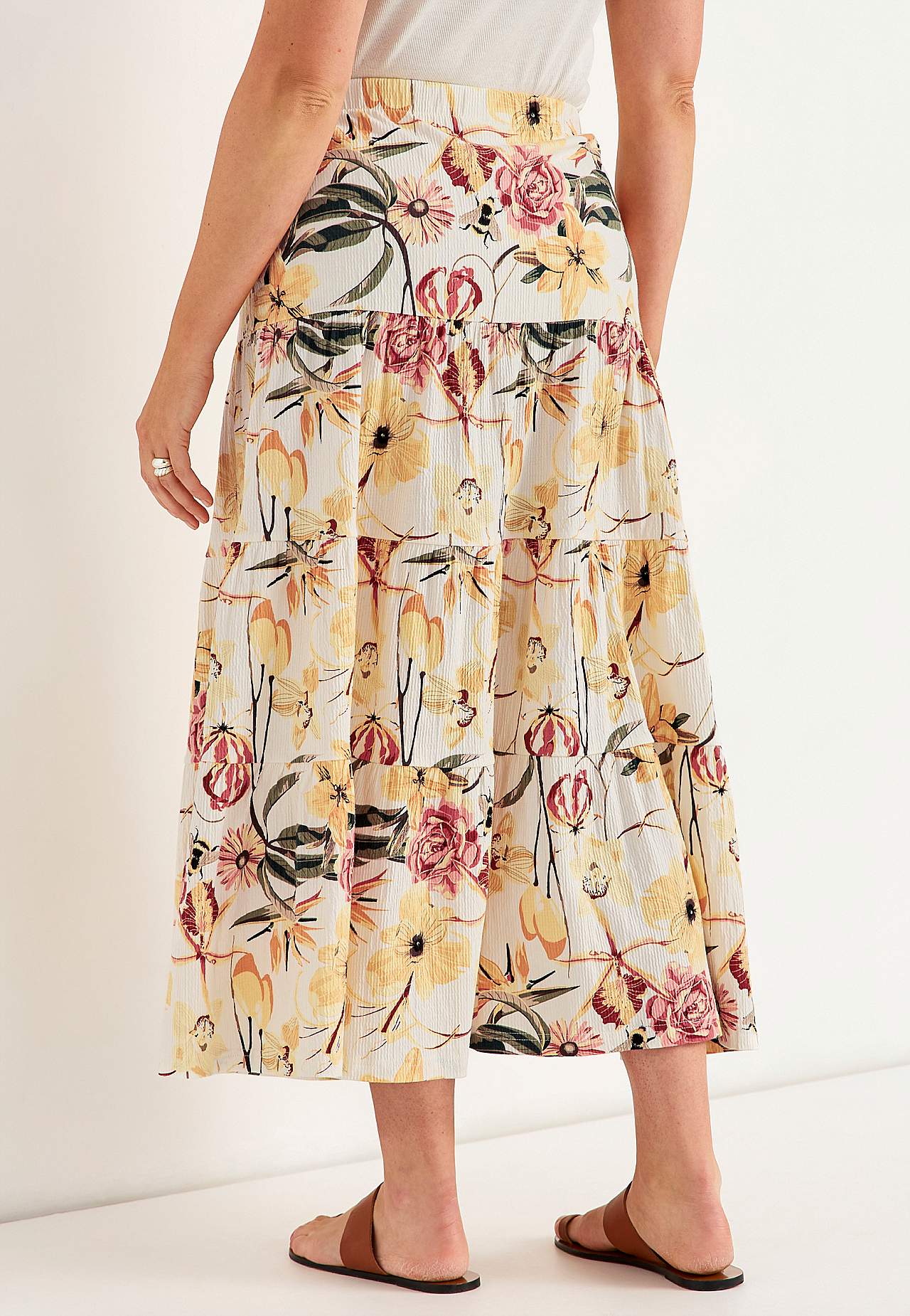 Miękka i elastyczna spódnica z falistą strukturą. Rozszerzany na dole fason ze szerokością na spodzie. Talia z miękką i szeroką gumą. Zaokrąglony brzeg. Połącz z 701369. Długość: 90 cm.