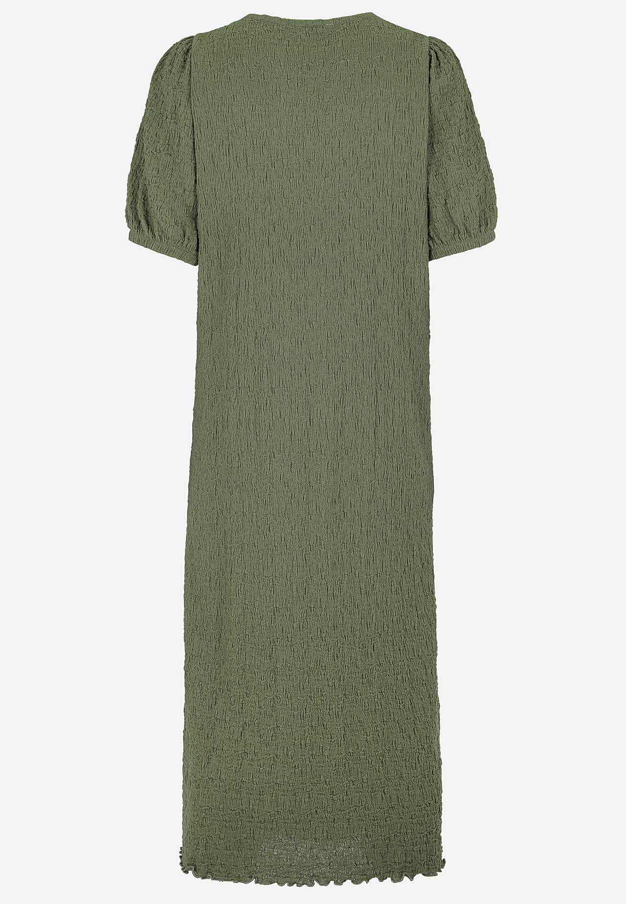 Kobieca sukienka z wygodnej mieszanki bawełny. Elastyczny materiał ze strukturą. Rugularny fason ze swobodną szerokością na spodzie. Zaokrąglona szyja. Marszczenie na ramionach. Krótkie bufki z gumką na mankietach. Wykończony overlockiem i falisty brzeg. Długość od ramienia ok. 122 cm we wszystkich rozmiarach.