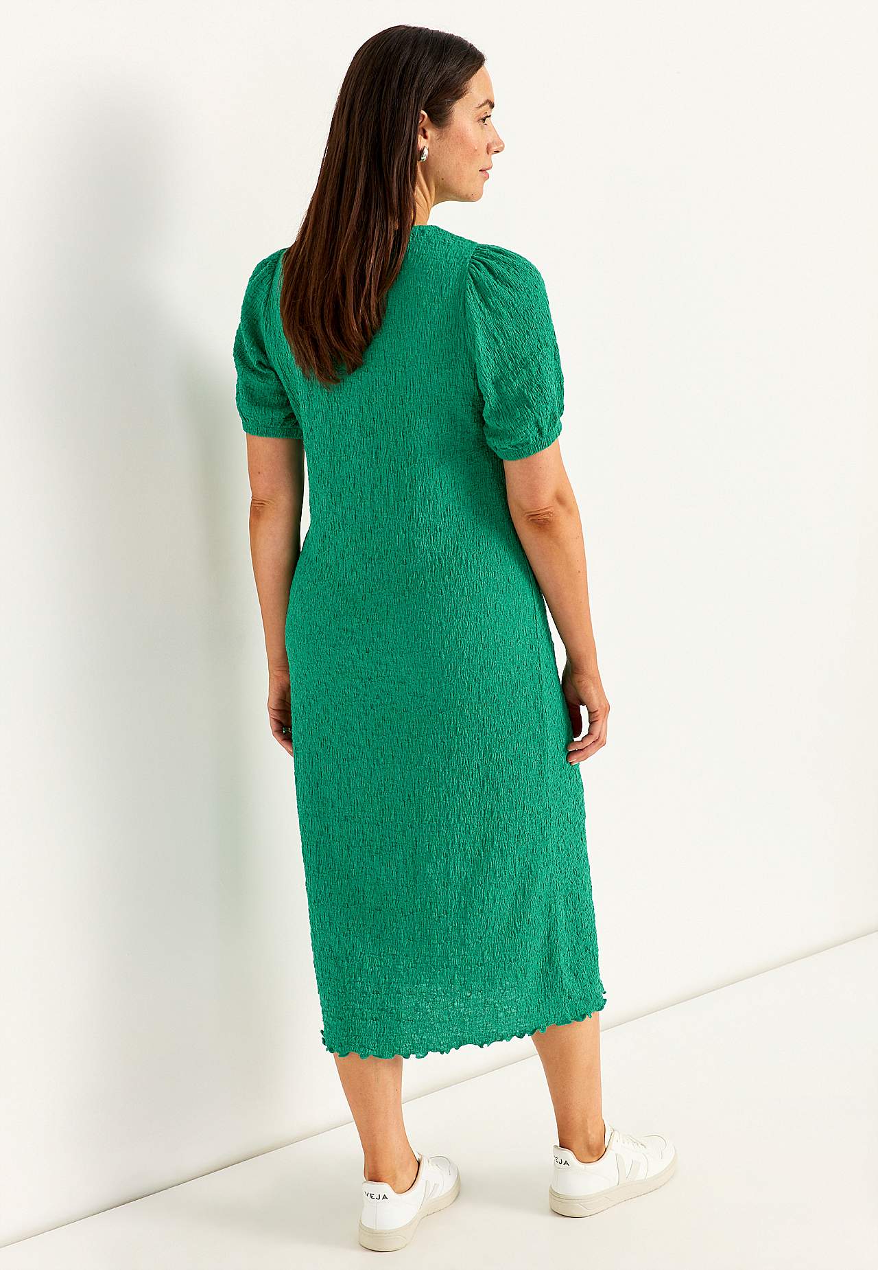 Kobieca sukienka z wygodnej mieszanki bawełny. Elastyczny materiał ze strukturą. Rugularny fason ze swobodną szerokością na spodzie. Zaokrąglona szyja. Marszczenie na ramionach. Krótkie bufki z gumką na mankietach. Wykończony overlockiem i falisty brzeg. Długość od ramienia ok. 122 cm we wszystkich rozmiarach.