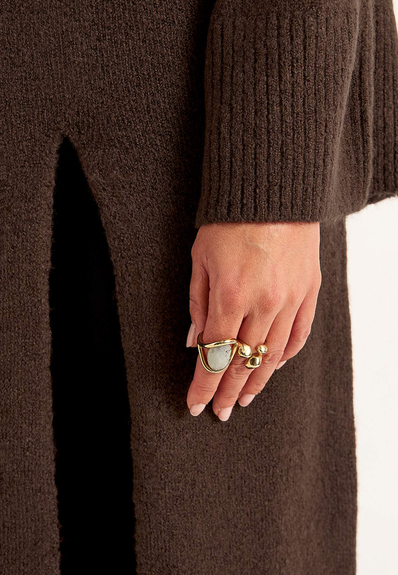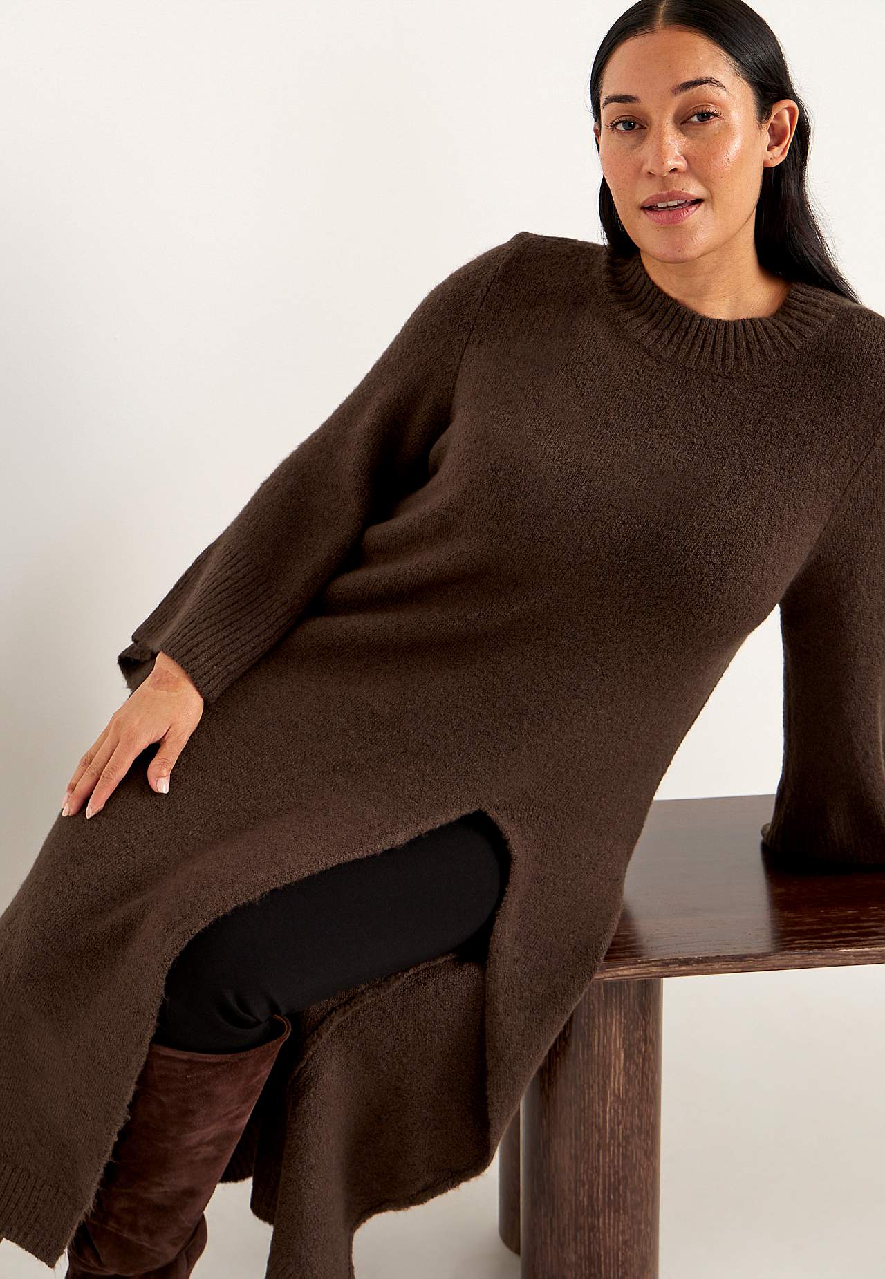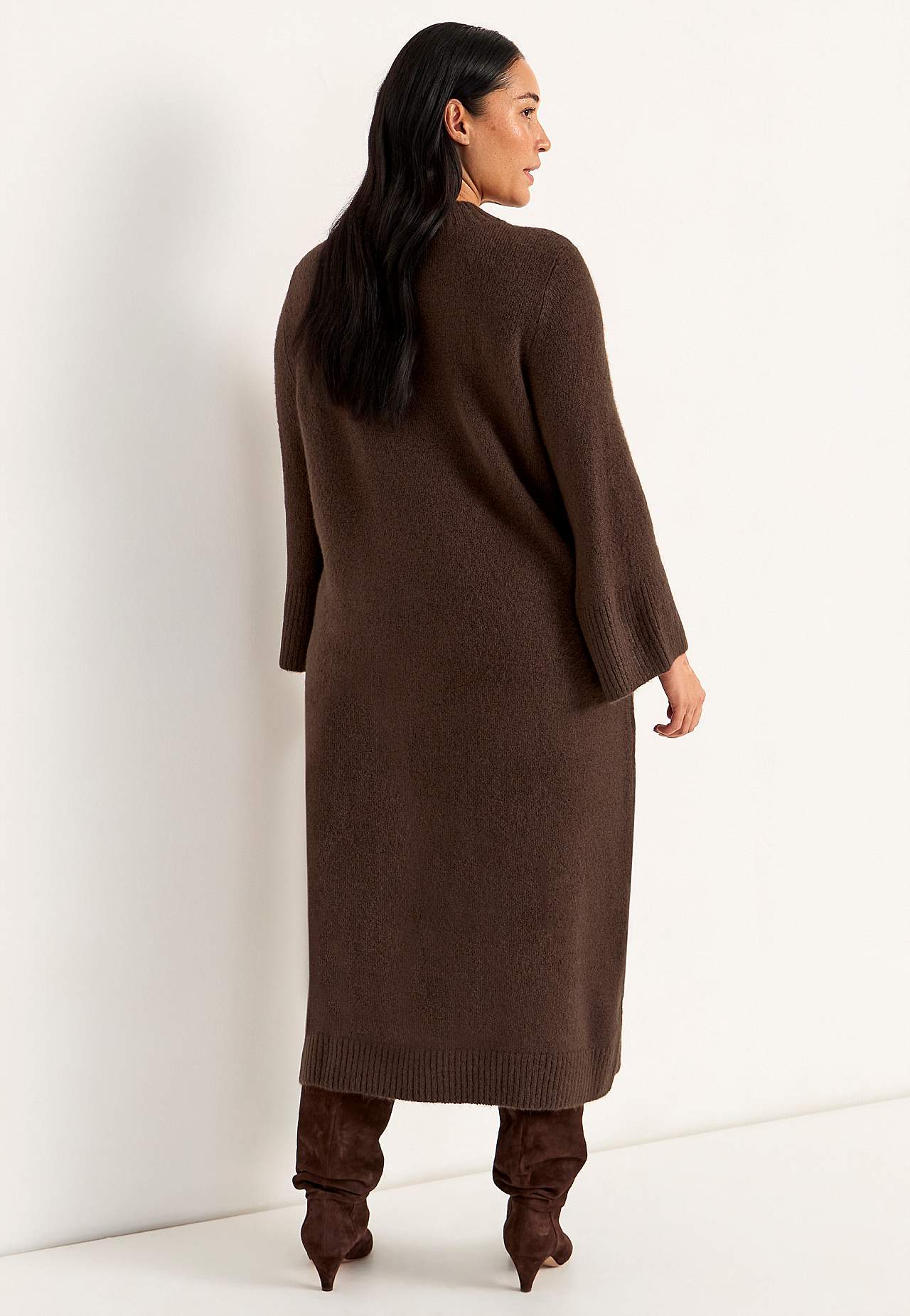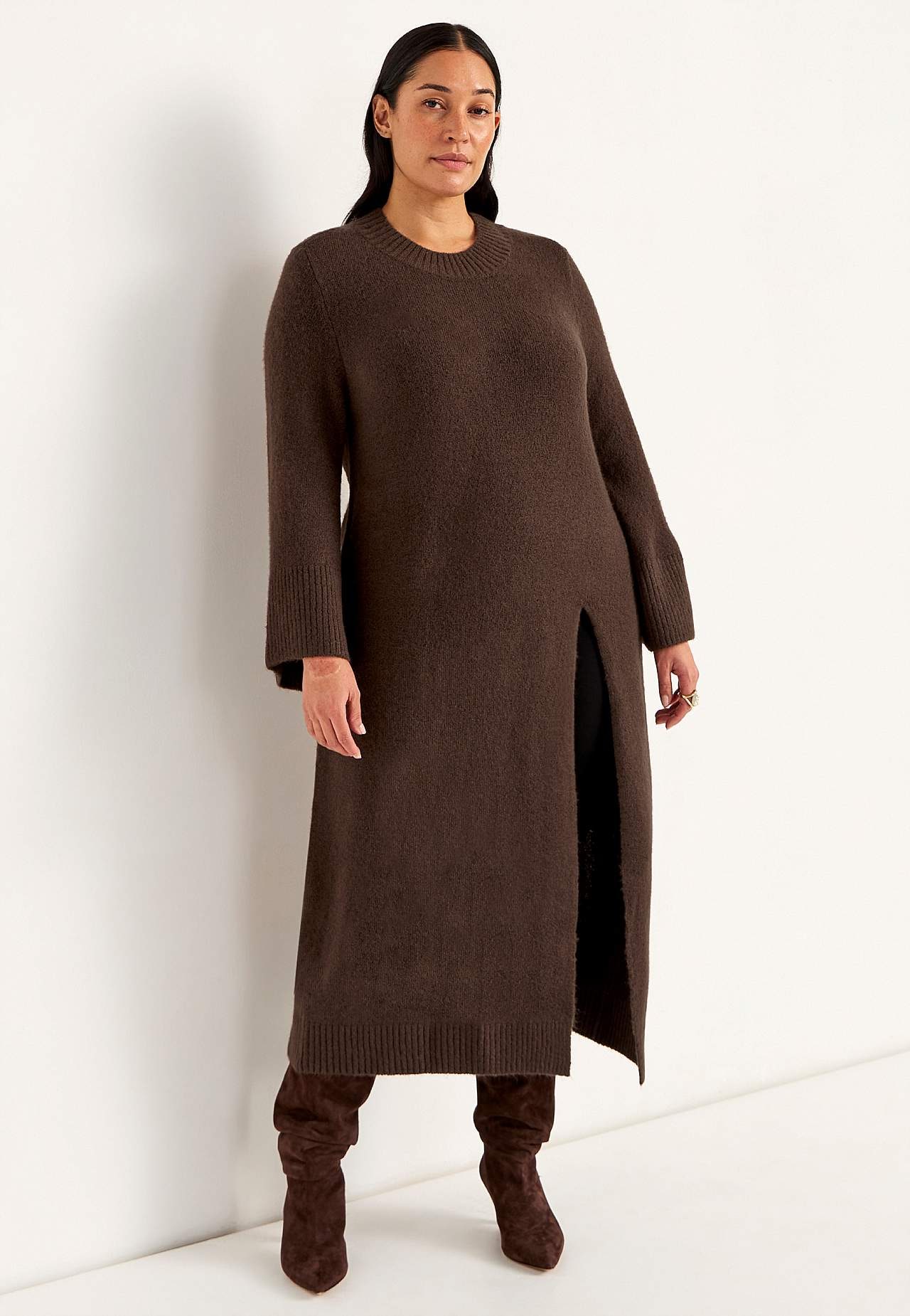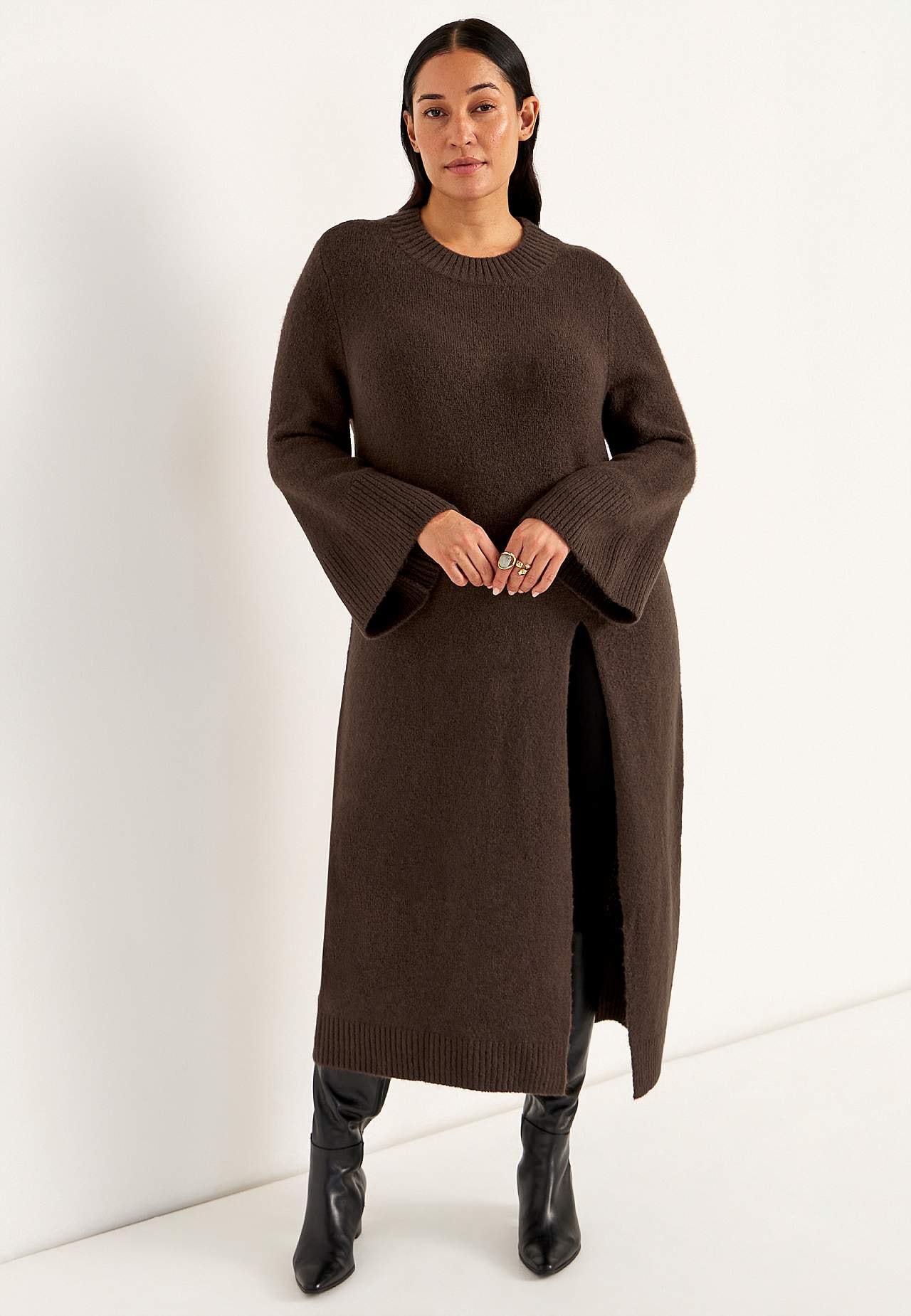 Dzianinowa i miękka sukienka z rozcięciem z przodu. Prosty fason. Prążkowana i niska stójka. Szerokie rękawy o długości 3/4 ze szerokim prążkowanym mankietem na mankietach. Prosty prążkowany brzeg. Długość z tyłu zależna od rozmiaru, ok. 112 cm.