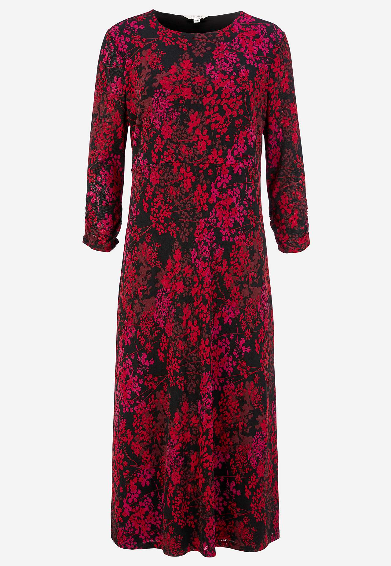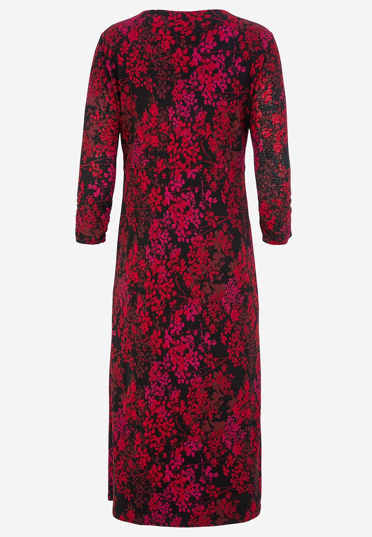 Zwiewna i elastyczna dżersejowa sukienka. Ładny fason z pięknym drapowaniem. Szew w talii. Miękka, elastyczna i szyta podszewka z dżerseju. Okrągły dekolt. Niepodszyte rękawy o długości 3/4 z marszczonymi wykończeniami rękawa. Wzór w kwiatki zakrywający wszystko. Długość midi. Prosty brzeg. Długość od ramienia ok. 121 cm we... Czytaj więcej