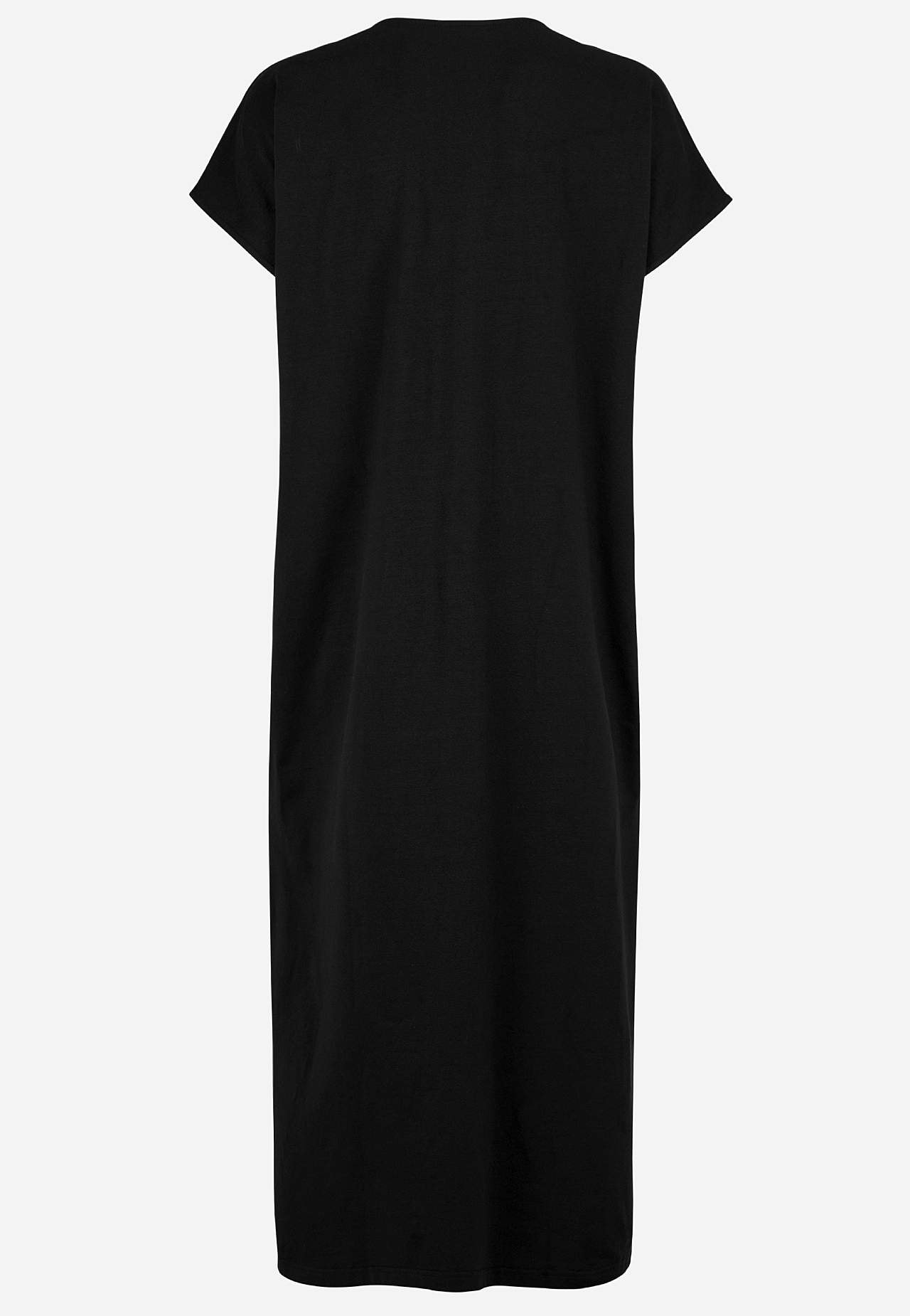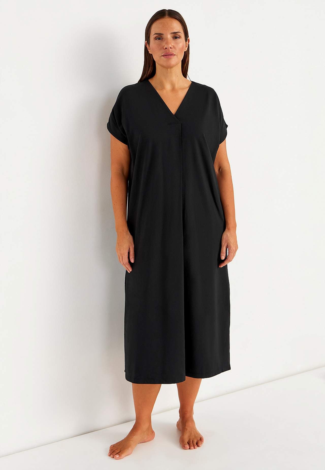 Miękka i elastyczna sukienka plażowa z ekologicznej bawełny. Klasyczny model kaftanu. Luźny fason. Prosty brzeg z wysokim rozcięciem po bokach. Długość z tyłu zależna od rozmiaru, ok. 128 cm.