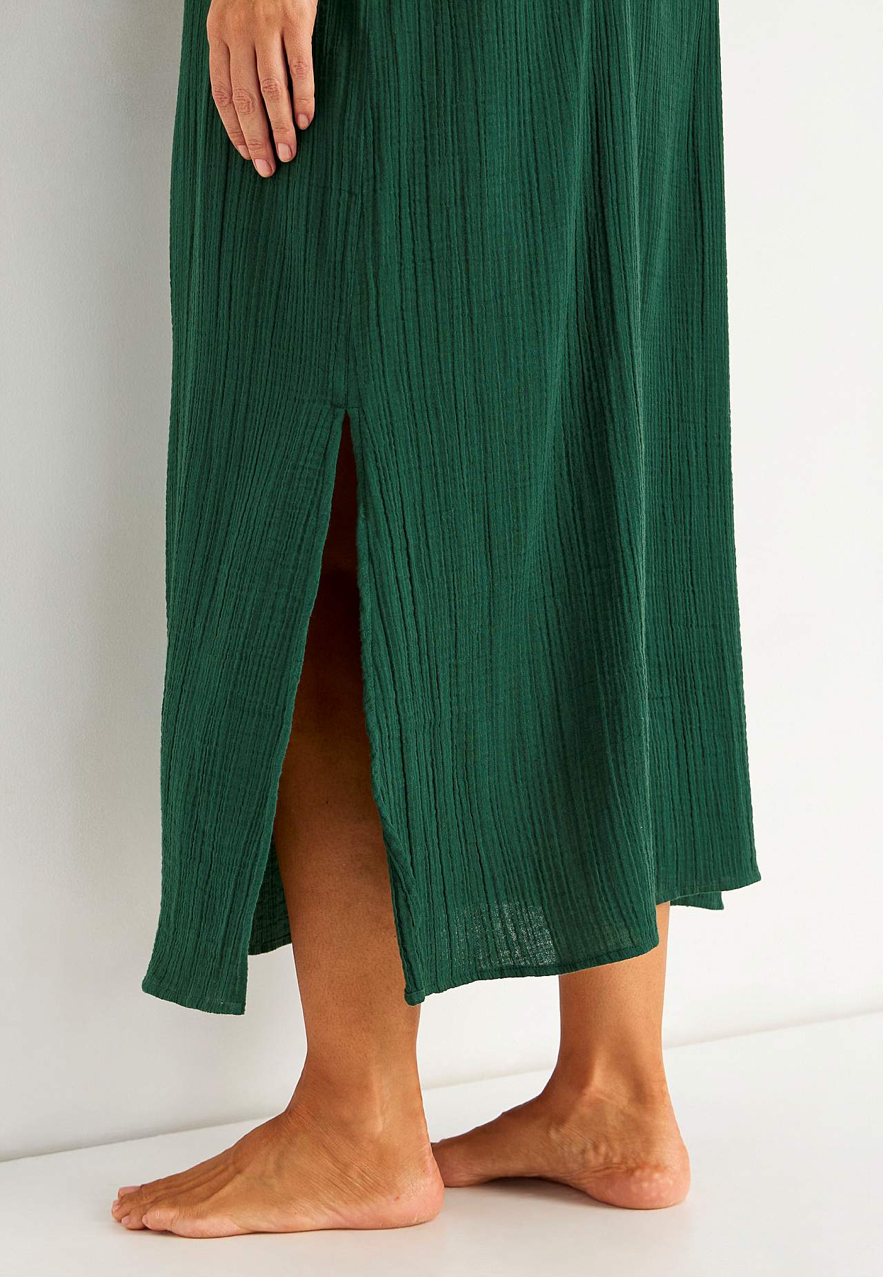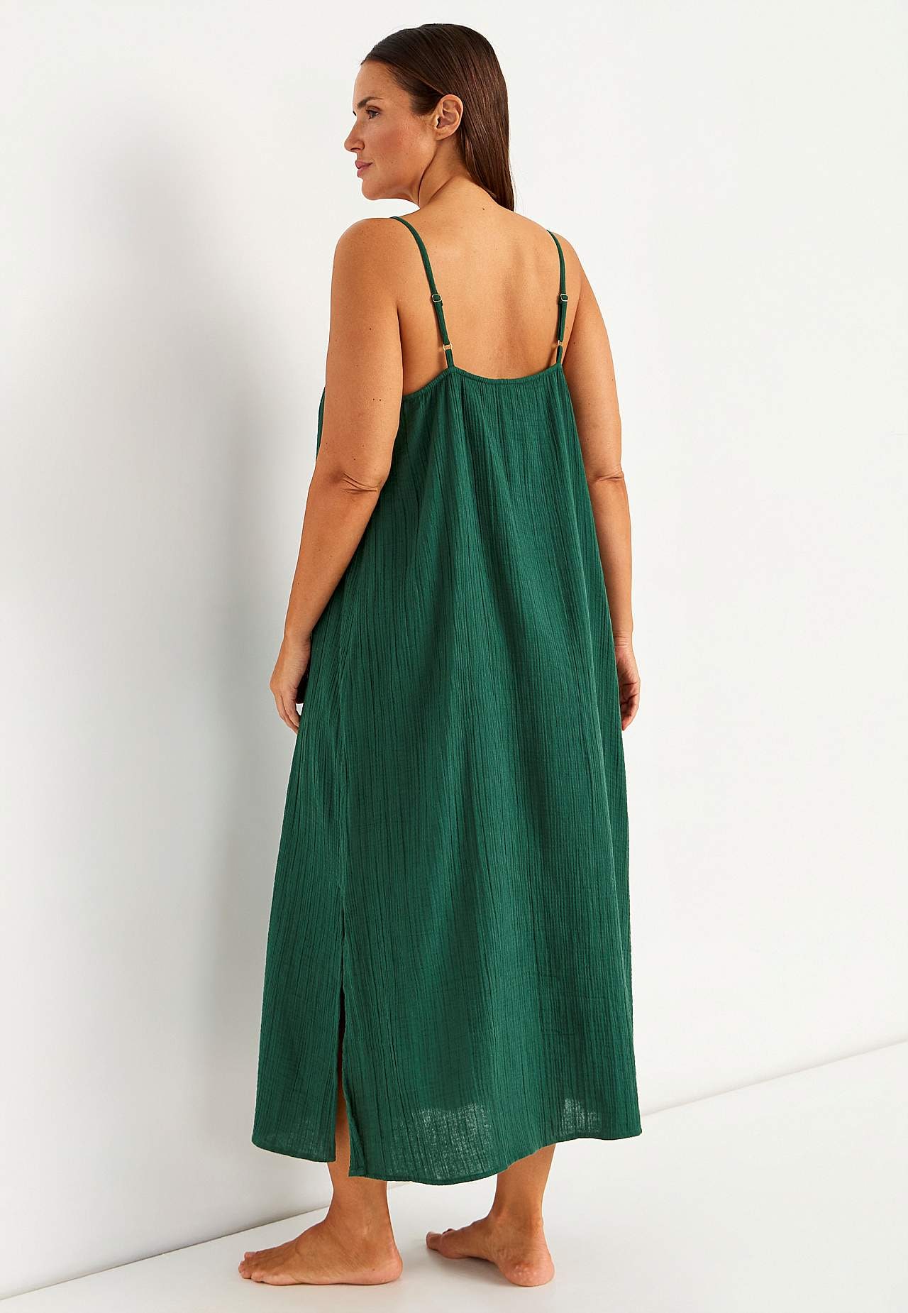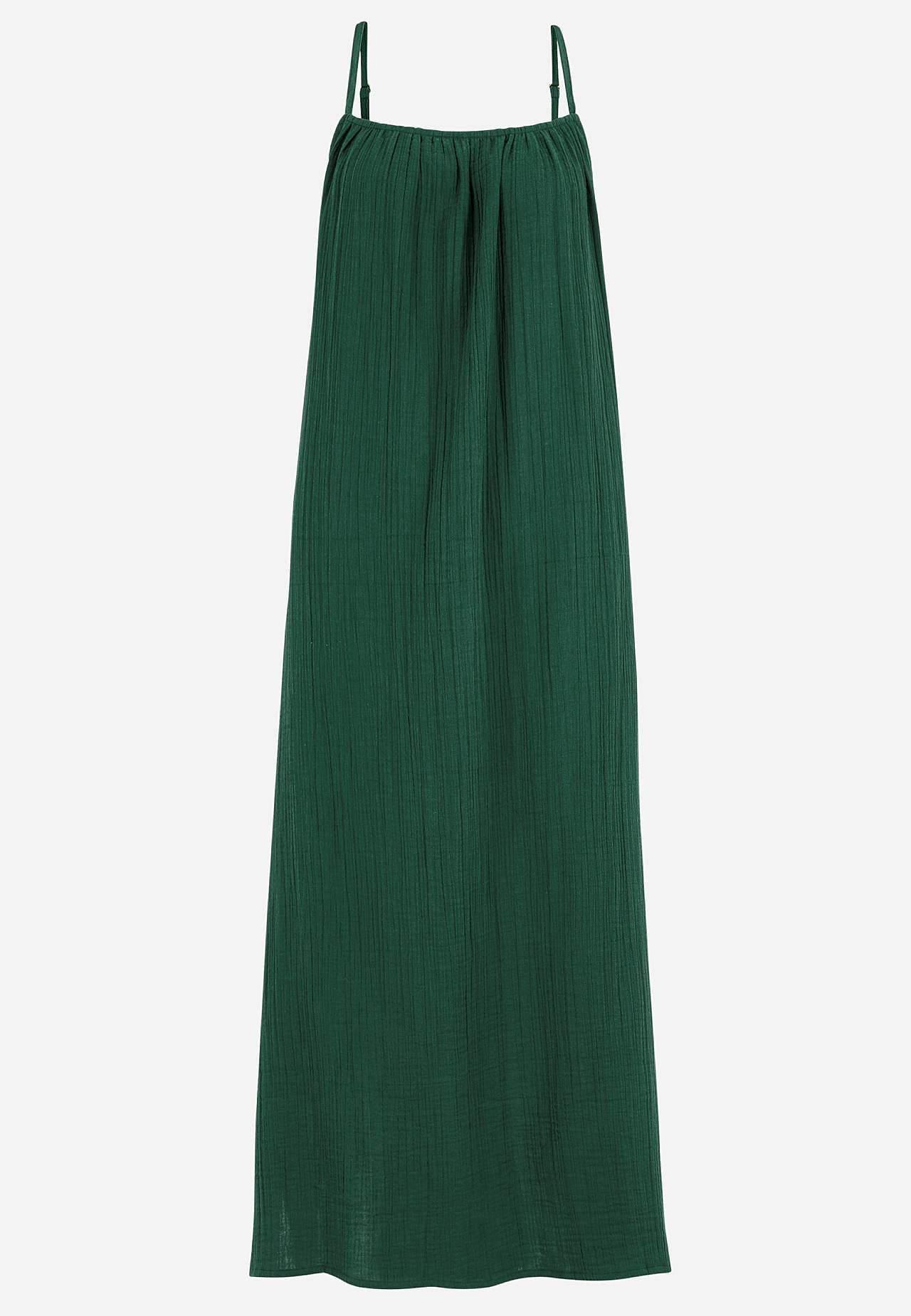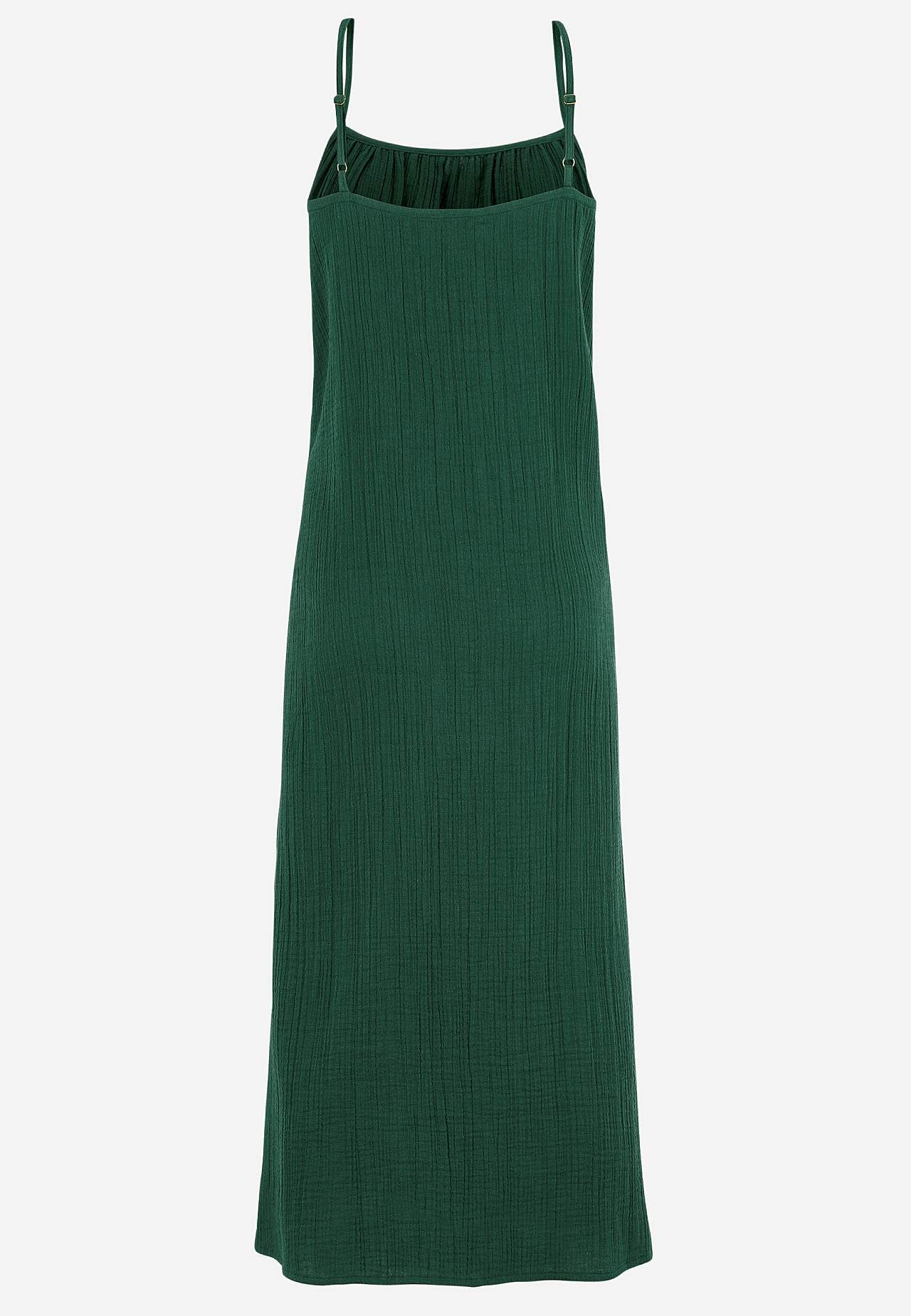 Sukienka z muślinu bawełnianego z naturalną strukturą. Tkany i miękki materiał z przewiewnym i chłodzącym uczuciem. Przestronny i prosty fason. Cienkie regulowane paski na ramieniu. Prosty brzeg z wysokim rozcięciem po bokach. Długość różni się w zależności od rozmiaru i wynosi około 114-121 cm w środkowej części frontu.
