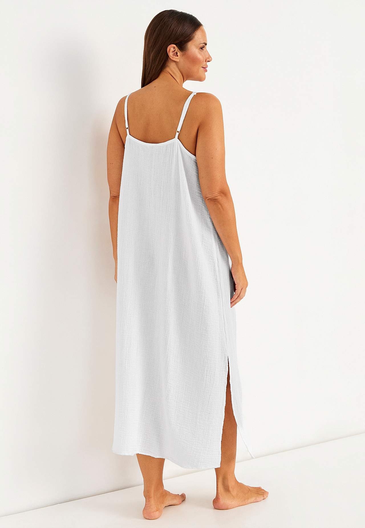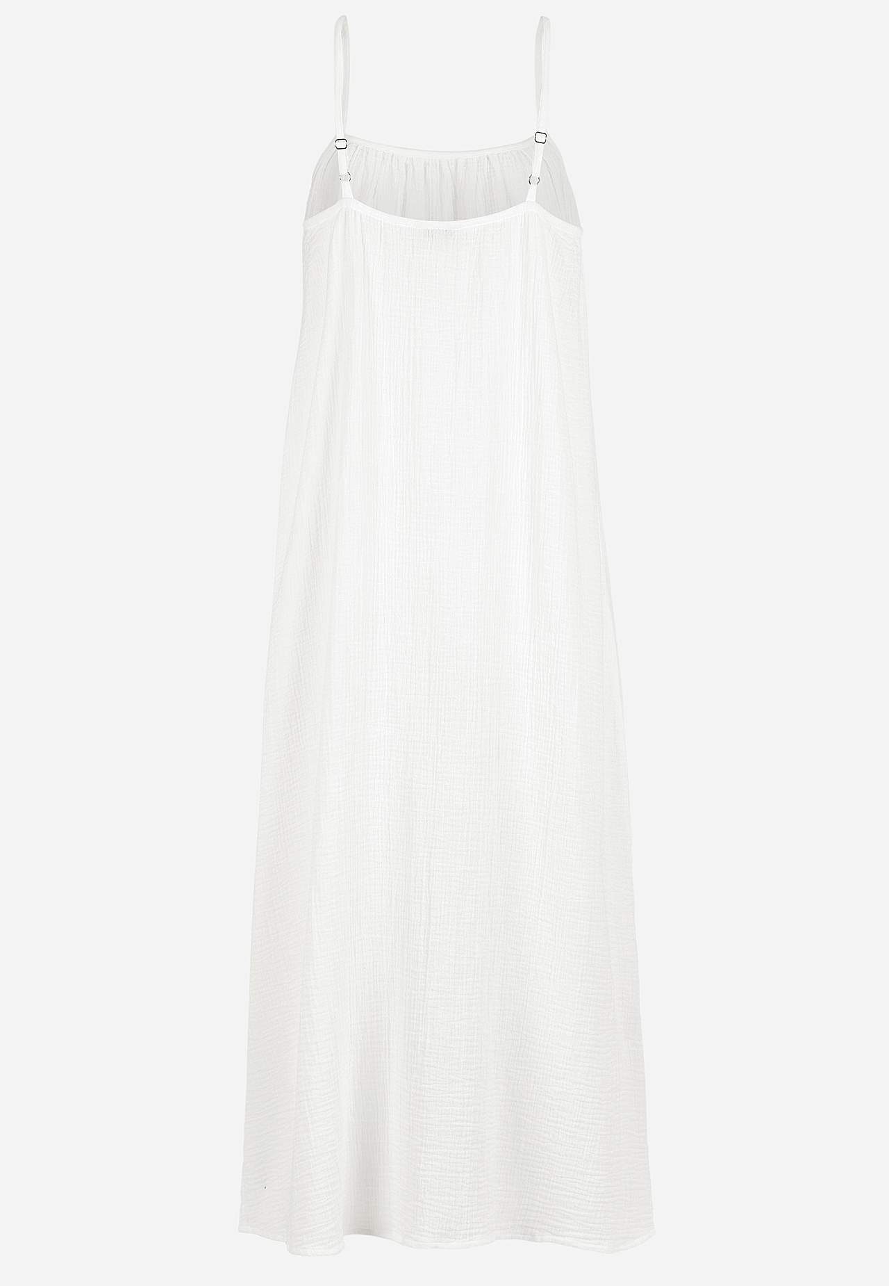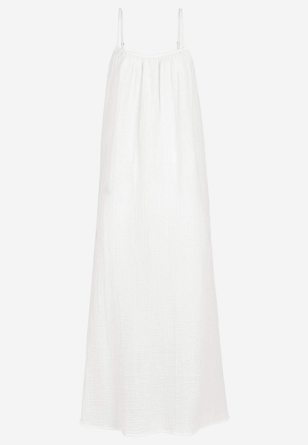 Sukienka z muślinu bawełnianego z naturalną strukturą. Tkany i miękki materiał z przewiewnym i chłodzącym uczuciem. Przestronny i prosty fason. Cienkie regulowane paski na ramieniu. Prosty brzeg z wysokim rozcięciem po bokach. Długość różni się w zależności od rozmiaru i wynosi około 114-121 cm w środkowej części frontu.