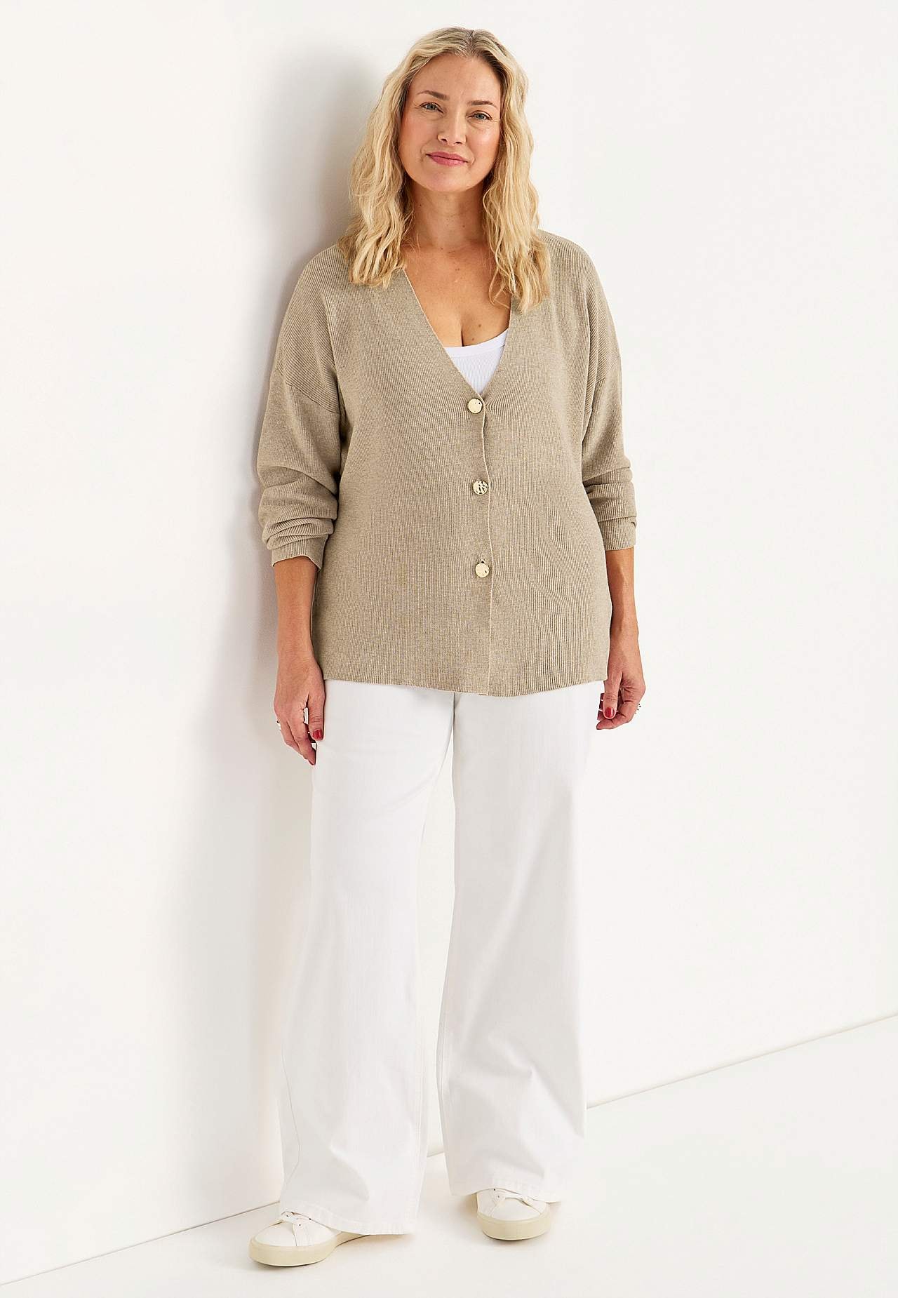 Miękki i elastyczny rozpinany sweter z guzikami. Lekko dopasowany do ciała fason. Szyja z nieco głębszym dekoltem w serek. Dekoracyjne guziki. Ramię z nieco obniżoną linią ramion. Długie i proste rękawy. Fajnie się nosi na bluzce lub podkoszulku. Długość od ramion w zależności od rozmiaru ok. 65-73 cm.