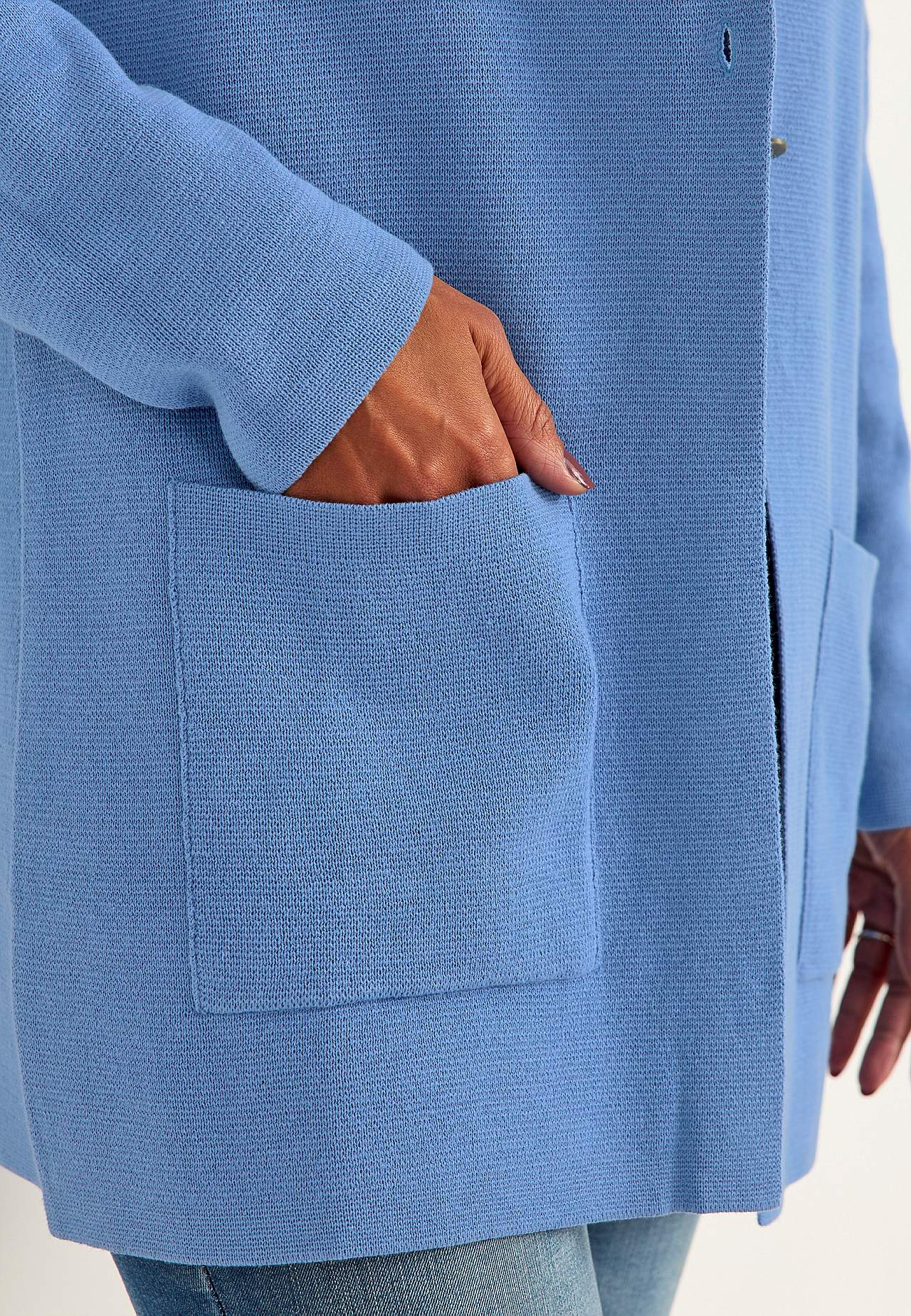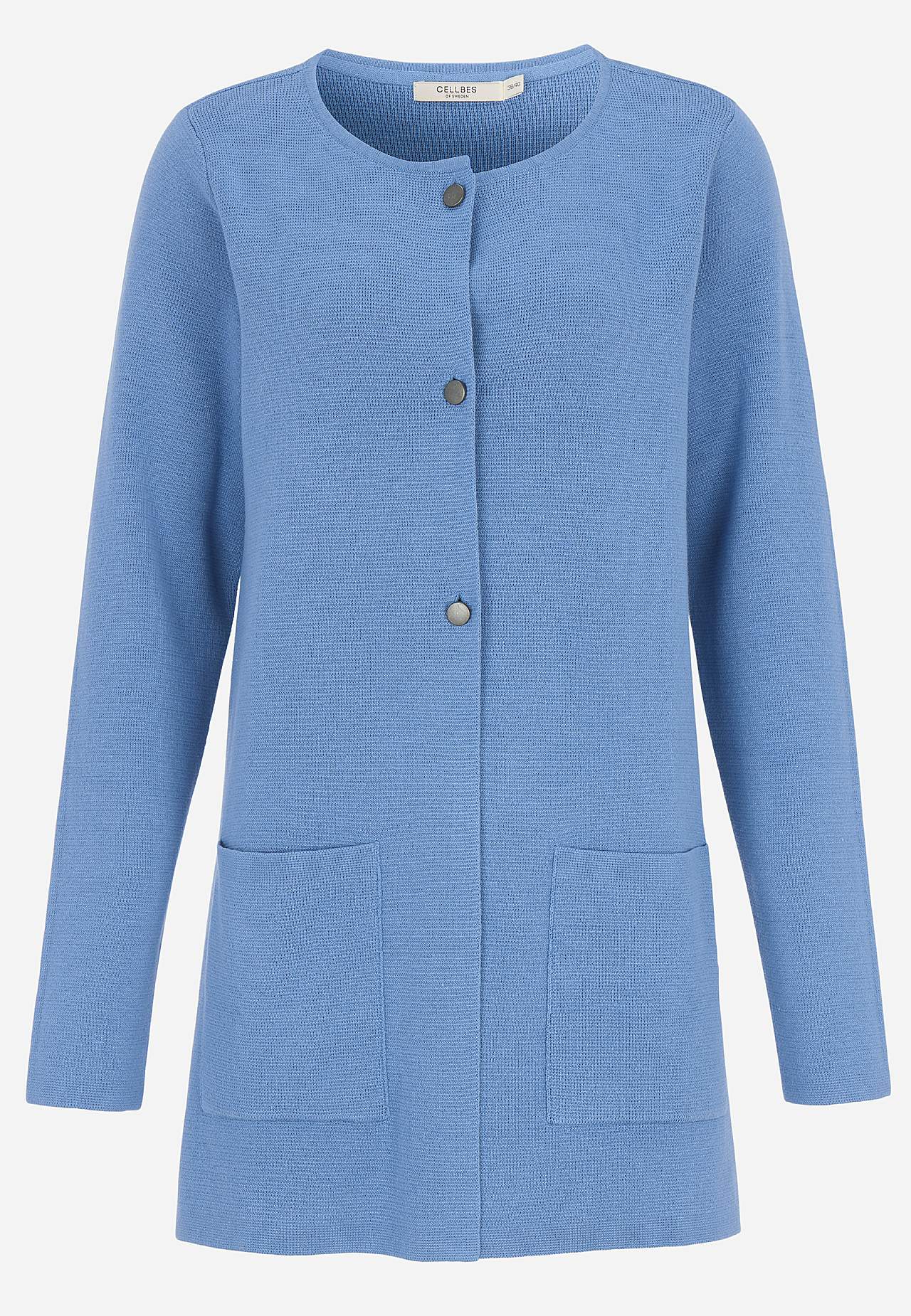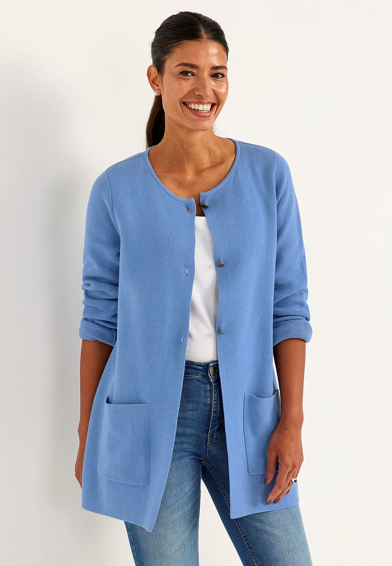 Rozpinany sweter cienko dziergany ze sztywnej i miękkiej jakości bawełny z miłą strukturą. Gładki i stylowy design idealny na cały rok. Nieco dłuższy fason z kieszeniami z przodu. Prosty fason. Trzy ciemnosrebrne guziki. Długość od ramion w zależności od rozmiaru ok. 77-86 cm.