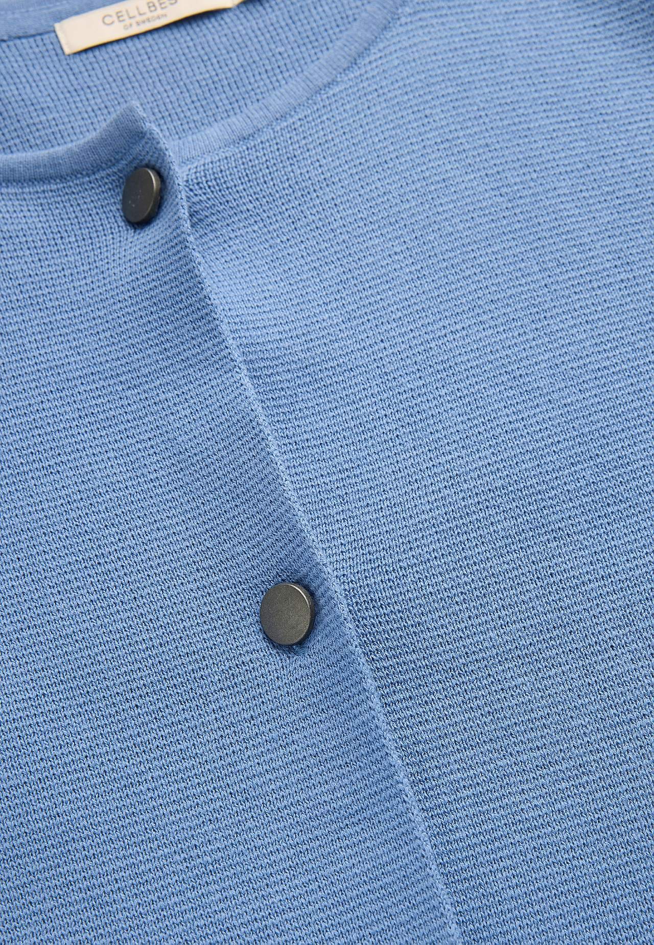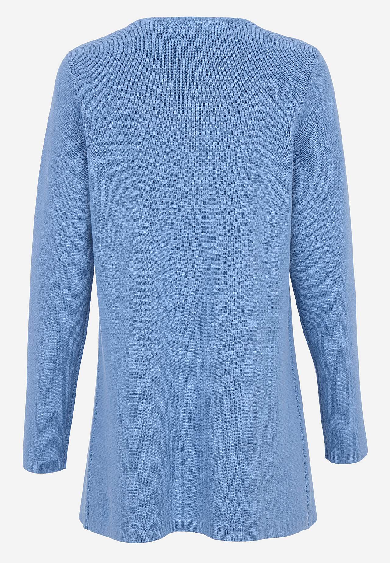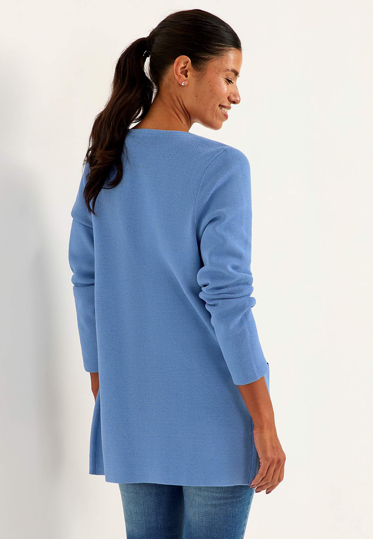 Rozpinany sweter cienko dziergany ze sztywnej i miękkiej jakości bawełny z miłą strukturą. Gładki i stylowy design idealny na cały rok. Nieco dłuższy fason z kieszeniami z przodu. Prosty fason. Trzy ciemnosrebrne guziki. Długość od ramion w zależności od rozmiaru ok. 77-86 cm.