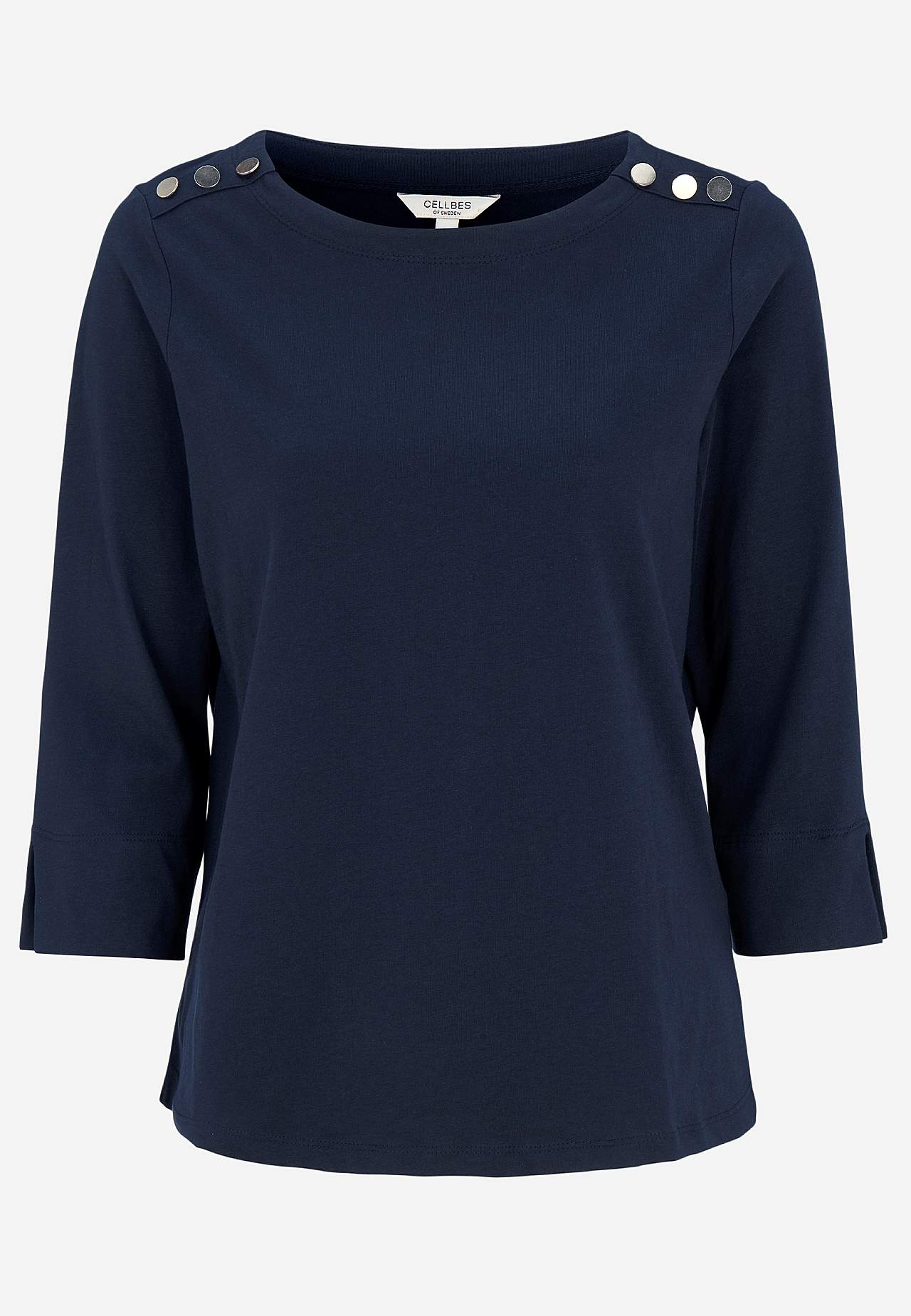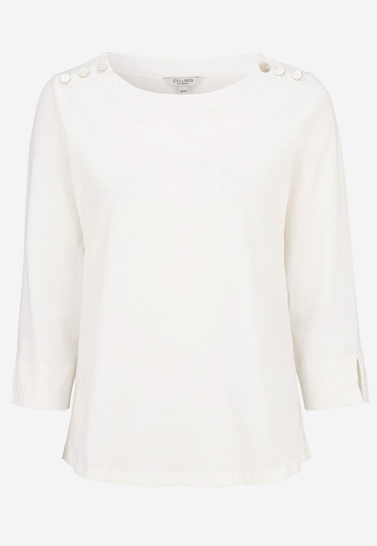 Top z miękkiej bawełny z ozdobnymi guzikami na ramionach. Rugularny fason. Lekki design w linie. Fason z lekkim dekoltem łódką. Rękawy o długości 3/4. Zaokrąglony brzeg. Długość od ramion w zależności od rozmiaru ok. 65-81 cm.