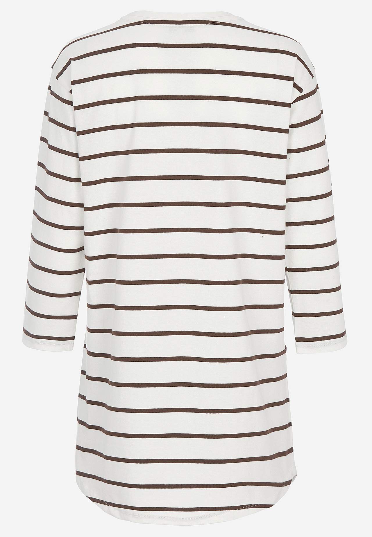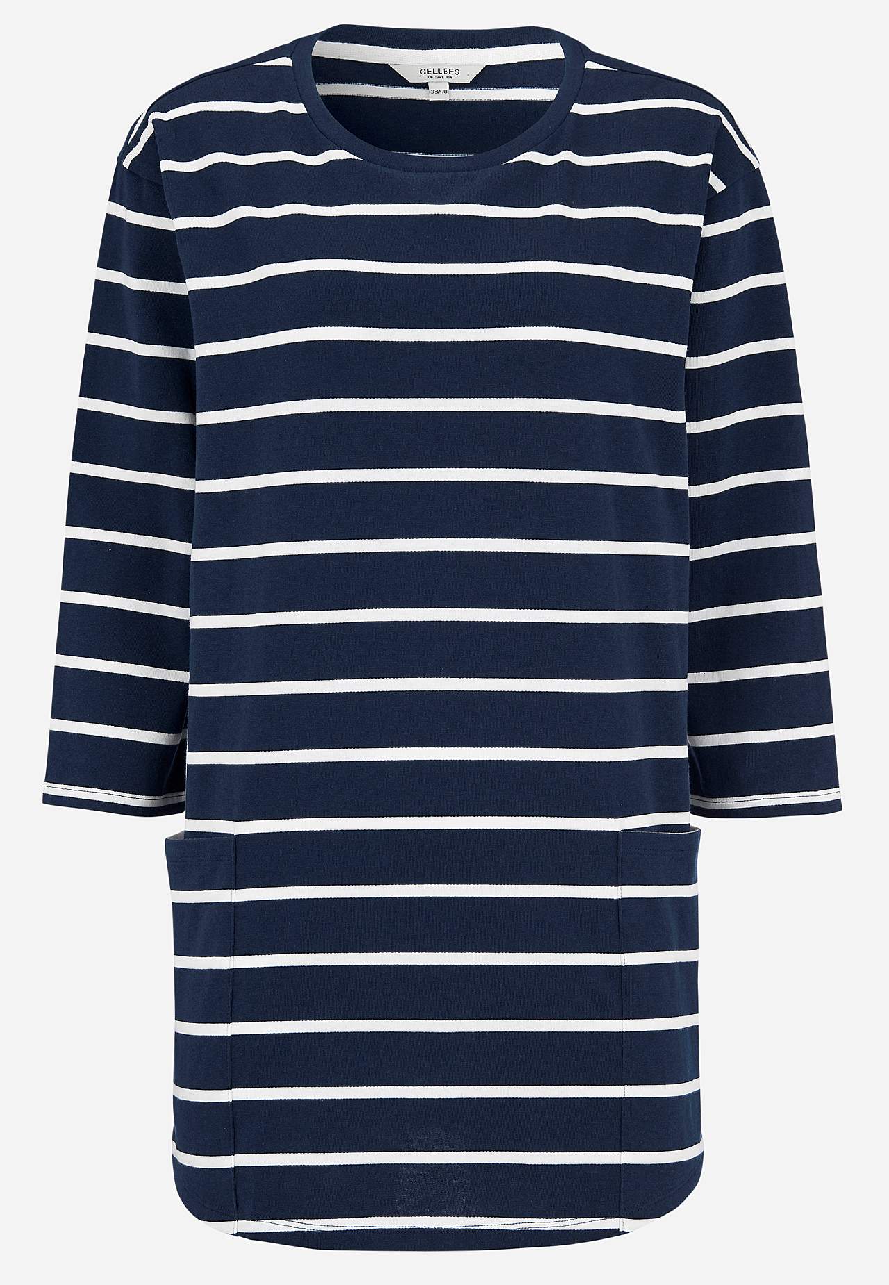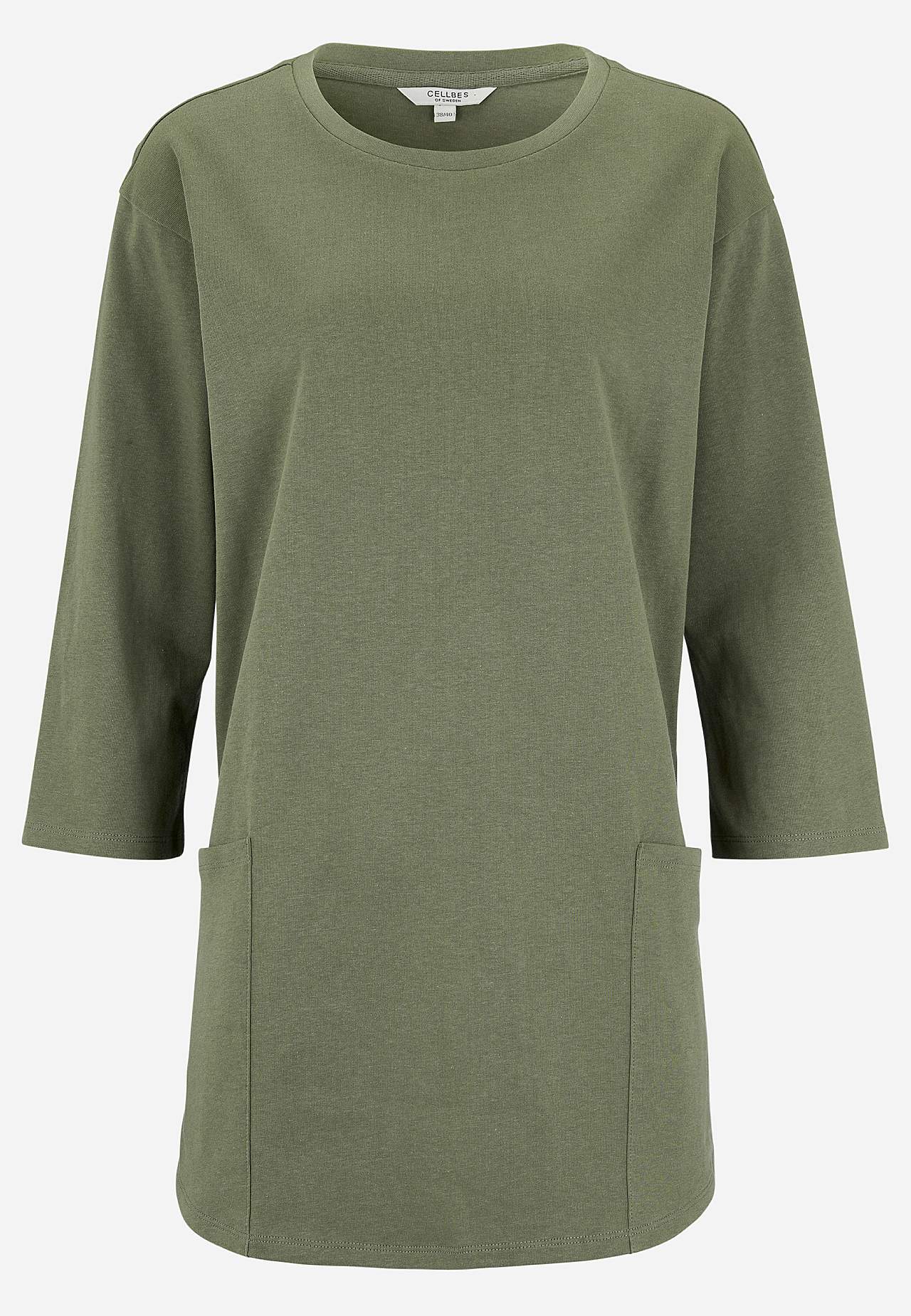 Tunika z wygodnymi i dużymi kieszeniami. Miękka, pewna i nieco grubsza jakość. Luźny fason. Zaokrąglony i prążkowany dekolt. Opadające ramię. Nieco szersze rękawy o długości 3/4. Duże naszyte przednie kieszenie. Zaokrąglony brzeg. Długość od ramion w zależności od rozmiaru ok. 78-92 cm.