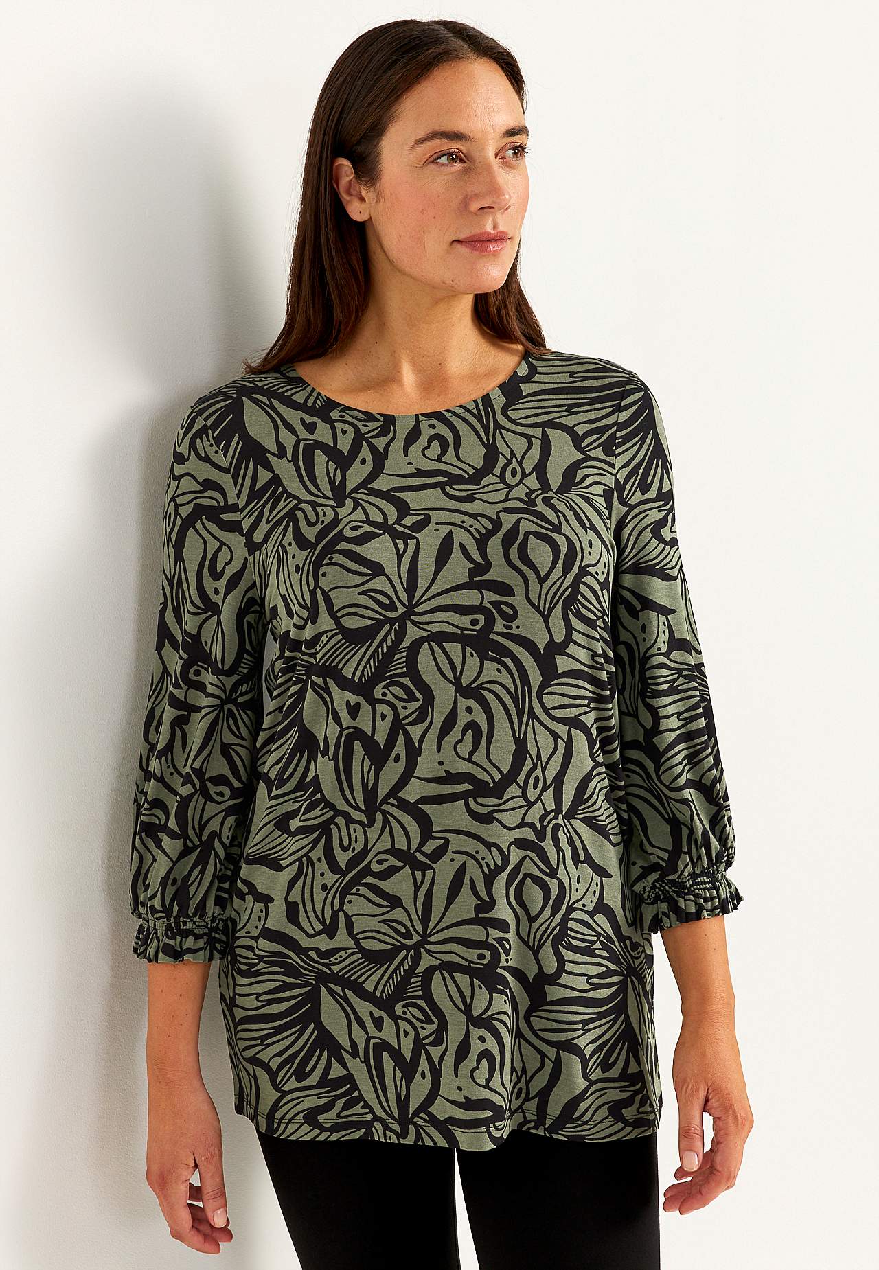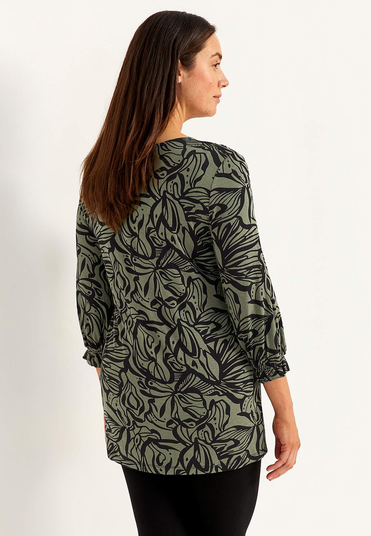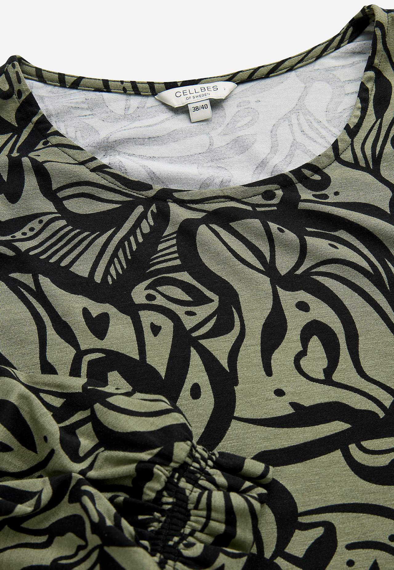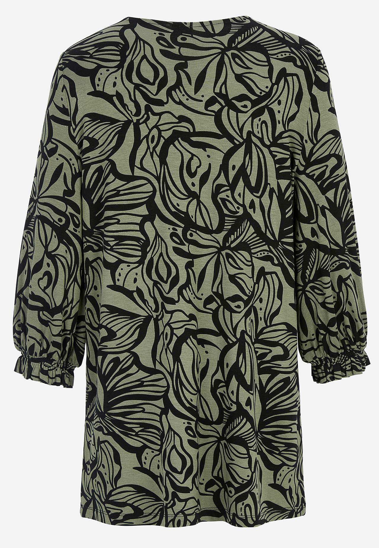 Miłe i ciężkie drapowanie. Rugularny fason. Zaokrąglona szyja. Szerokie rękawy o długości 3/4 i marszczenie na mankietach. Długość od ramion w zależności od rozmiaru ok. 73-80 cm.