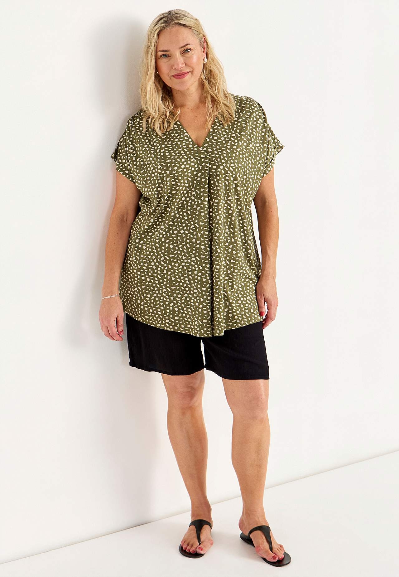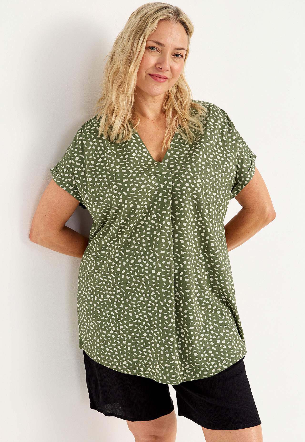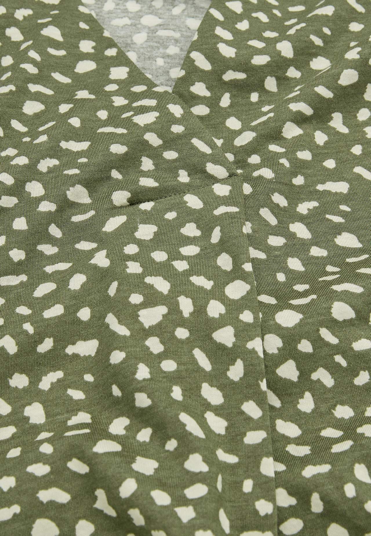 Top z dżerseju z przyjemnie miękkiej mieszanki bawełny i modalu. Fason o prostym kroju ze zaokrąglonym brzegiem. Fason z dużą zakładką z przodu i dekoltem w serek. Krótkie kimonowe rękawy z mankietem spodni. Dekoracyjne marszczone detale na ramionach. Długość od ramion w zależności od rozmiaru ok. 76-87 cm.