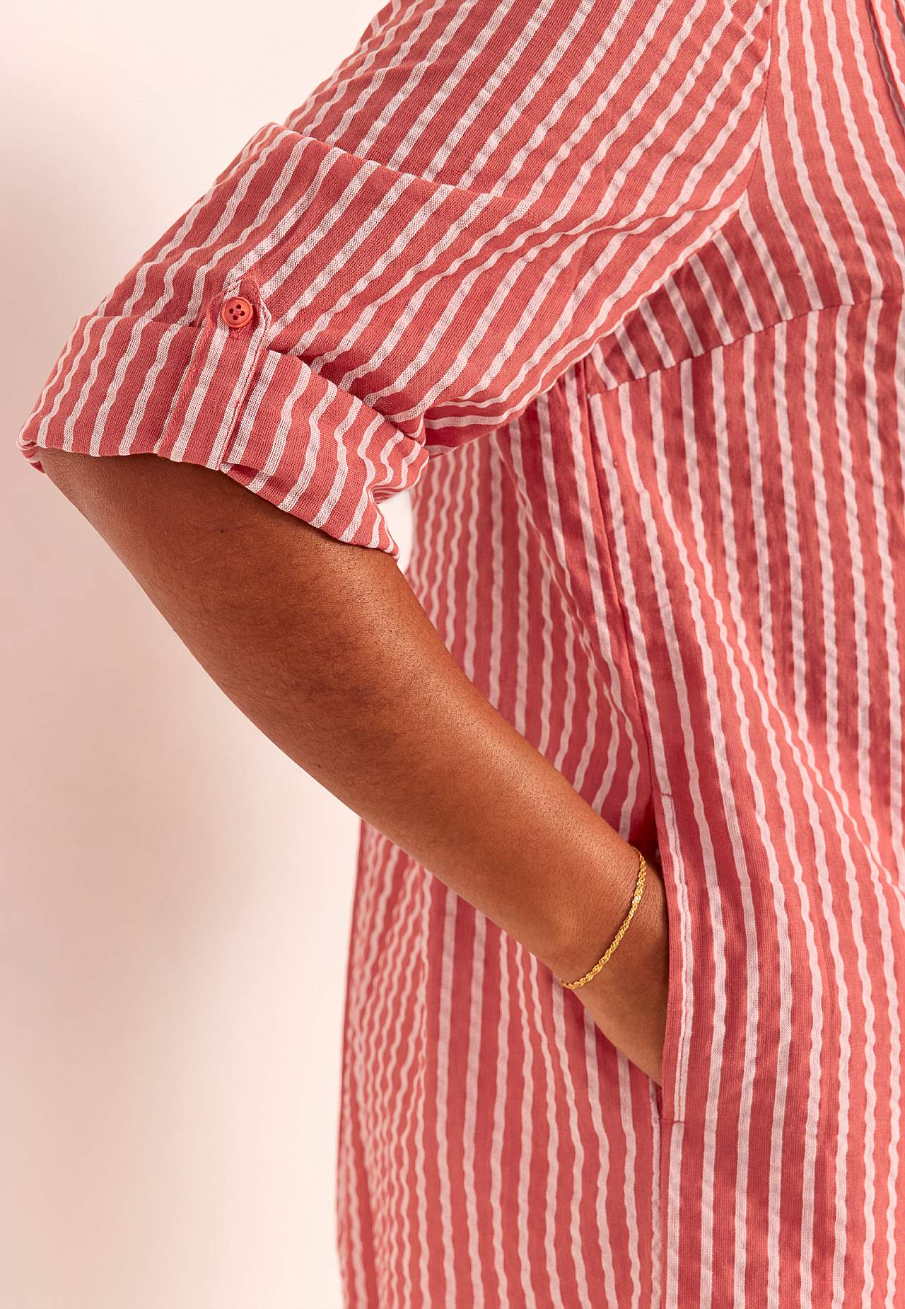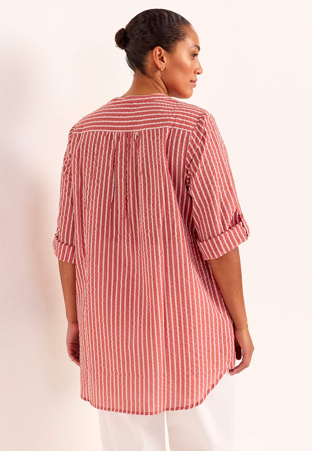 Przewiewna długa koszula z ozdobnym zaszyciem. Przyjemny materiał z kory. Zaokrąglony dekolt z otwarciem w kształcie V. Zapięcie na guziki. Szeroki rękaw podwijany i zapinany na guzik o długości 3/4. Kryte kieszenie po boku. Karczek z tyłu z marszczeniami. Długość od ramion w zależności od rozmiaru ok. 82-94 cm.